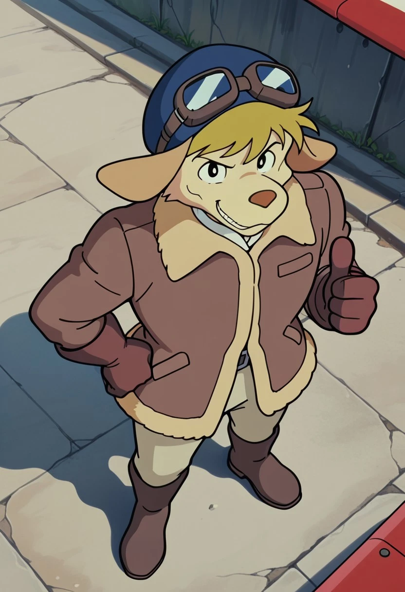 Tags (Pilot Outfit): Pilot, Pilot outfit, blue hat, goggles, obscured eyes, bomber jacket, brown jacket, brown gloves, brown boots, beige pants,