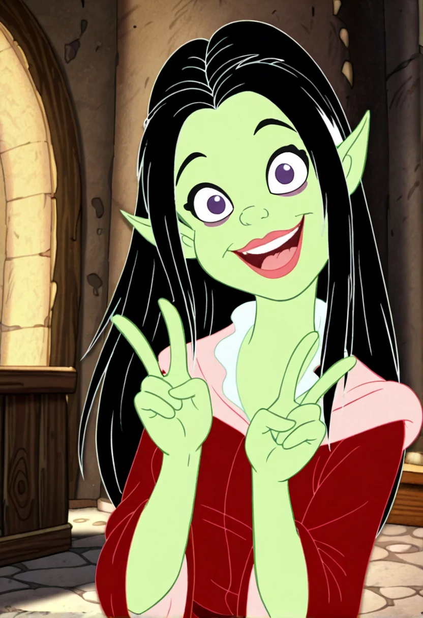 Trigger = tjald, Tags = 1girl, solo, black hair, long hair, lipstick, colored skin, green skin, purple eyes, red robe, pointy ears