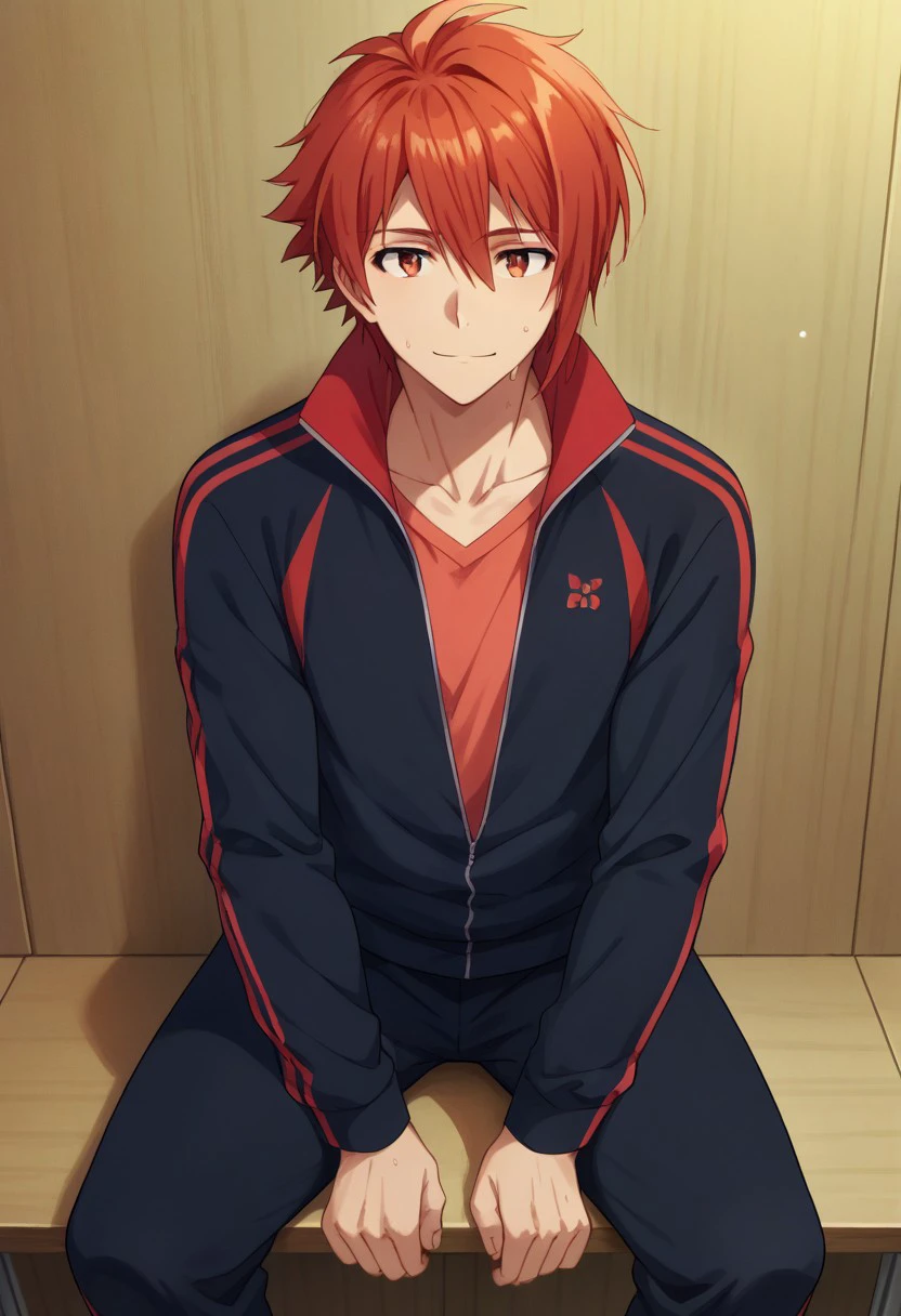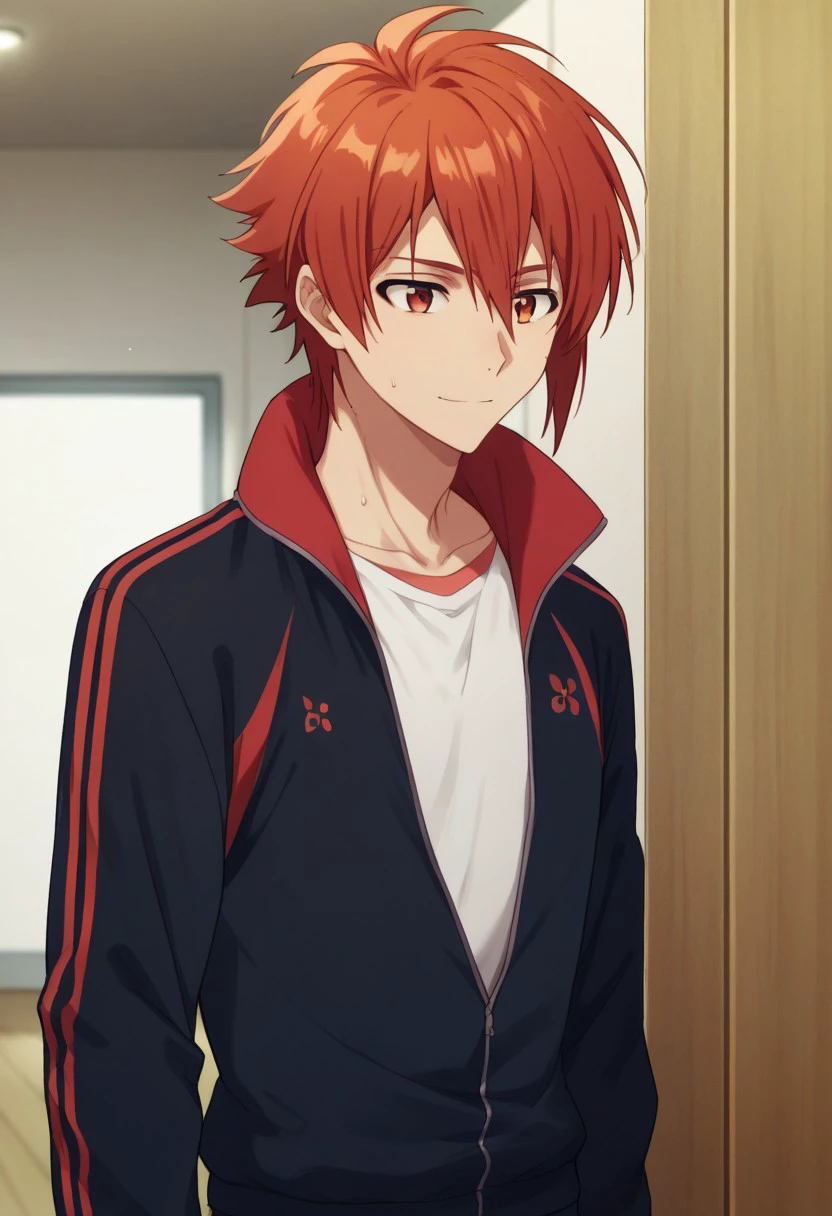 rikunanase, 1boy, male focus, solo, jacket, red hair, red eyes, track jacket, pants,