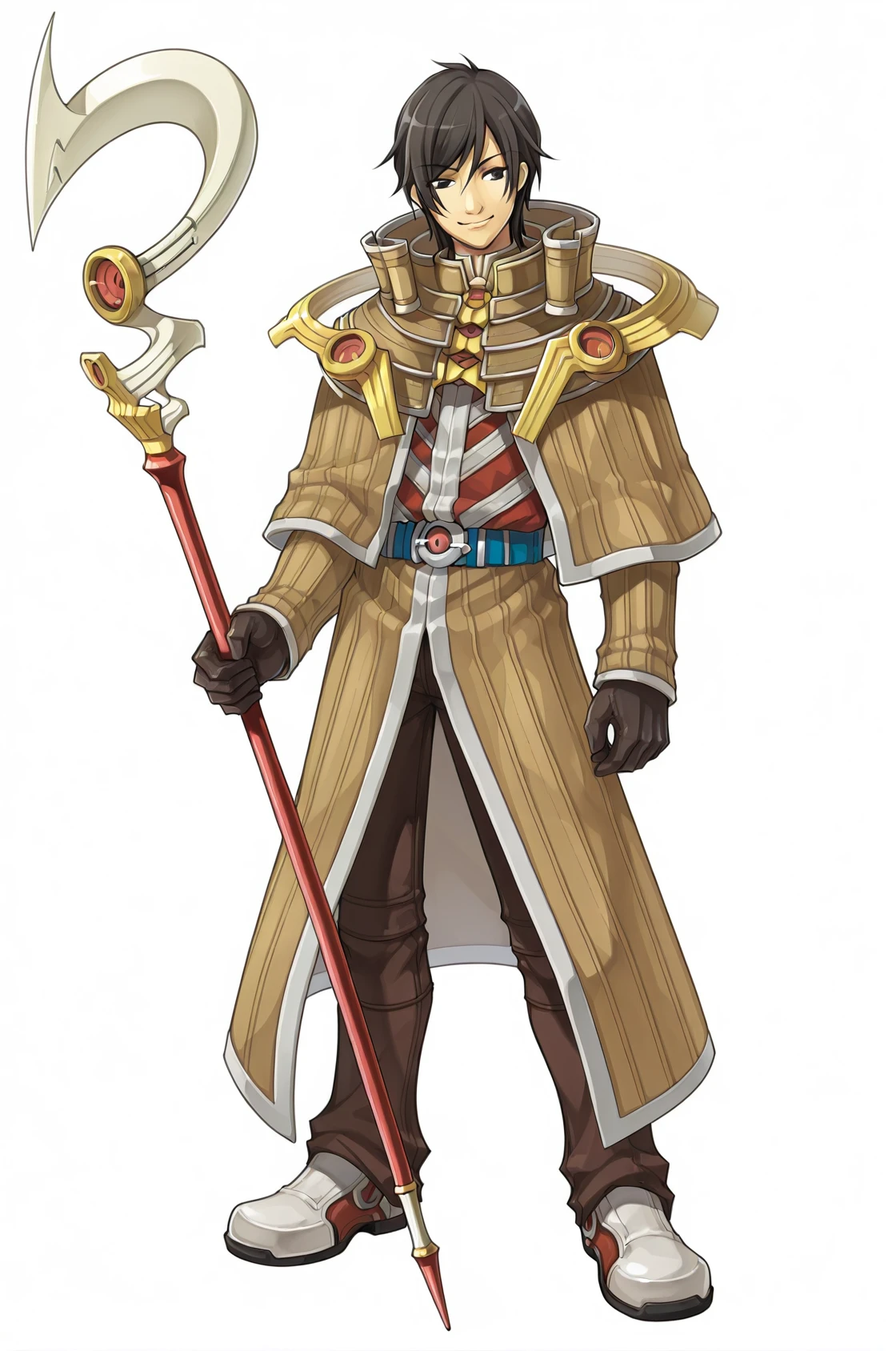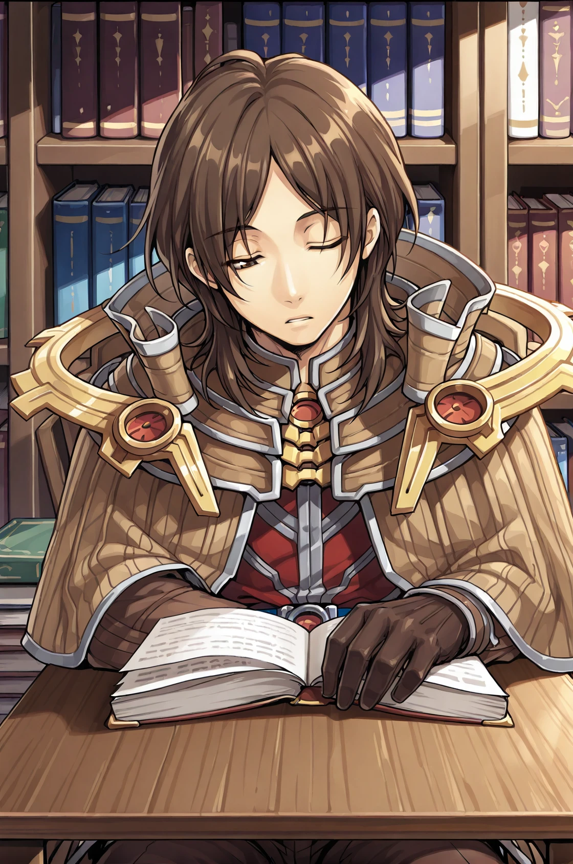 sageROMale, gloves, brown coat, brown capelet, long sleeves, shoulder armor, belt, pants, shoes