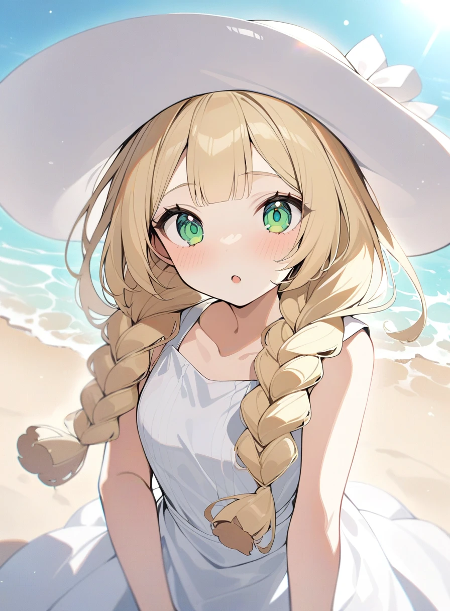 dress, sleeveless, sleeveless dress, white dress, hat, white headwear, sun hat
