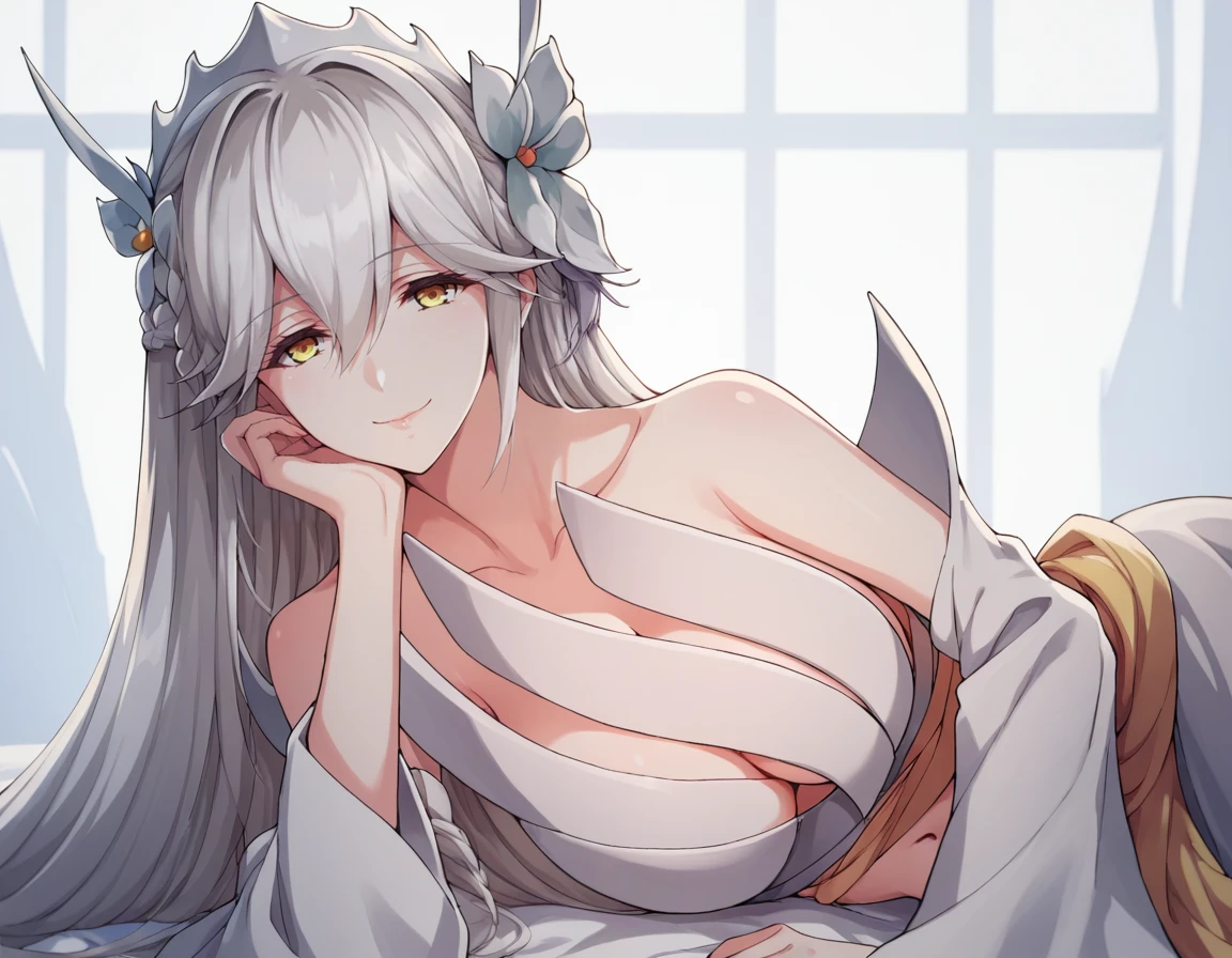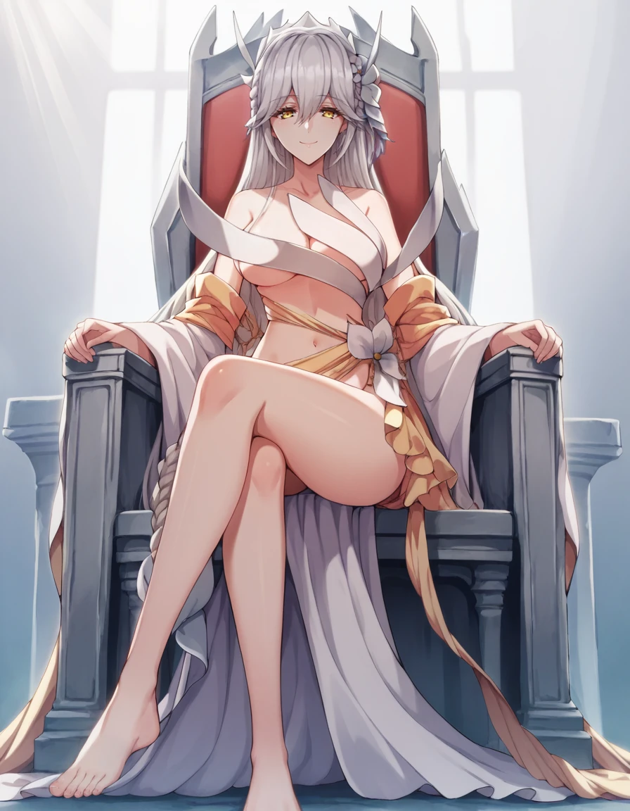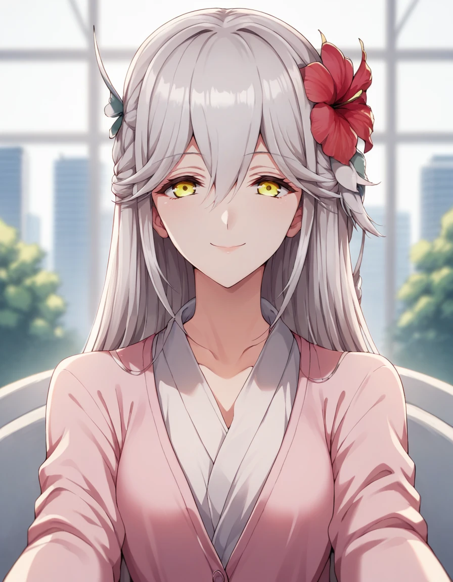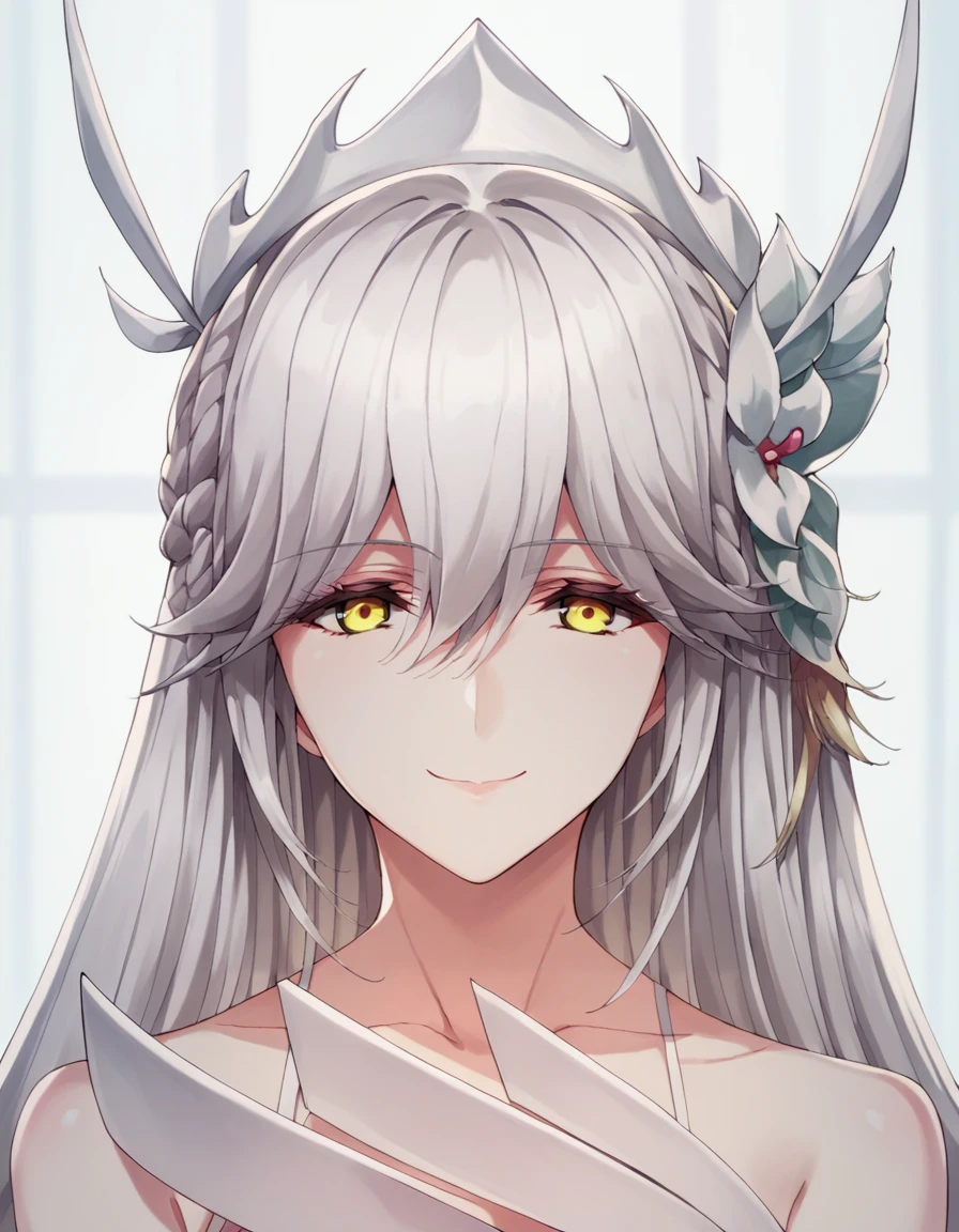 vysis, silver hair, very long hair, hair between eyes, hair ornament, hair flower, braid, yellow eyesOutfit