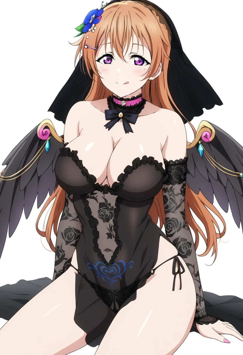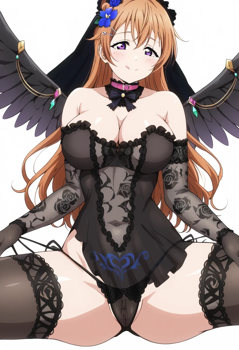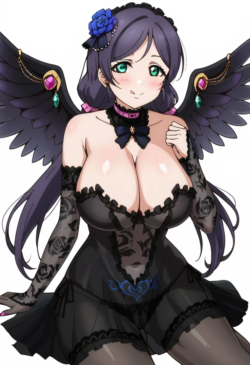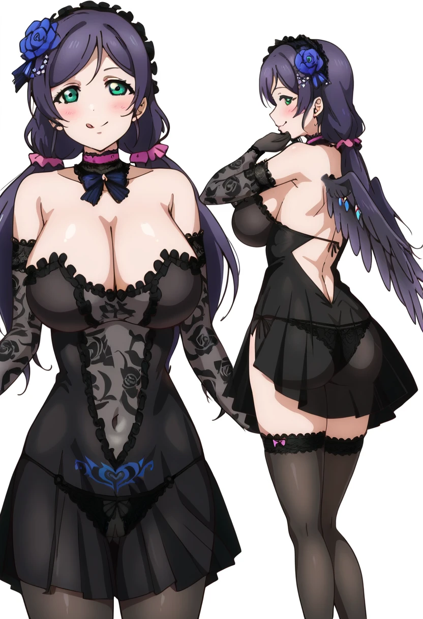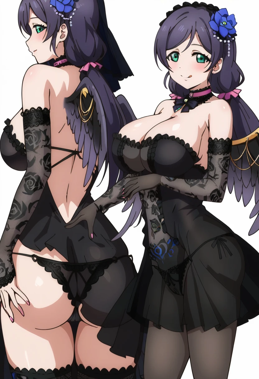 dress,black dress,strapless dress,backless dress, gloves,elbow gloves, underwear,lingerie, black thighhighs,black pantyhose, panties,black panties,string panties,lace panties,side-tie panties, hair ornament,hair flower,choker,detached collar, blue flower,bow, lace,lace trim, see-through,floral print,frills,jewelry,gem, pink nails, detached sleeves,lace-trimmed sleeves, covered navel,bare shoulders,cleavage, backless outfit,strapless,crotchless, veil,black wings,feathered wings,pubic tattoo,