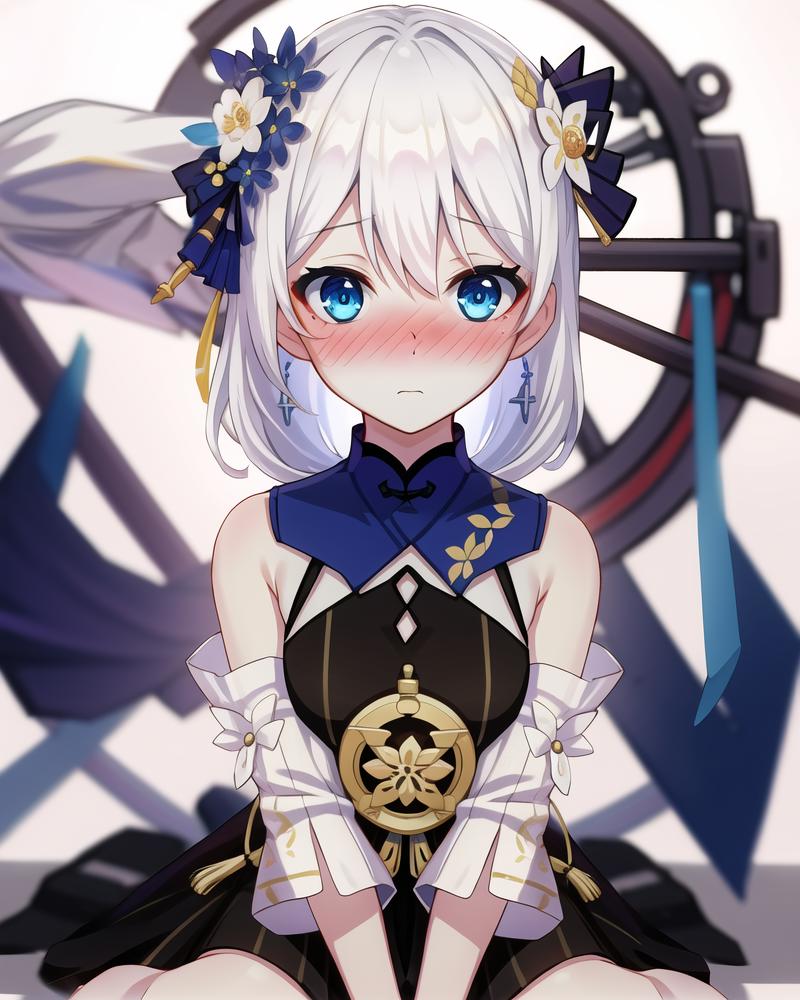 theresa_apocalypse,silver hair,blue eyes,dress, hair_ornament, chinese hairpin,detached_sleeves,hair bundle,