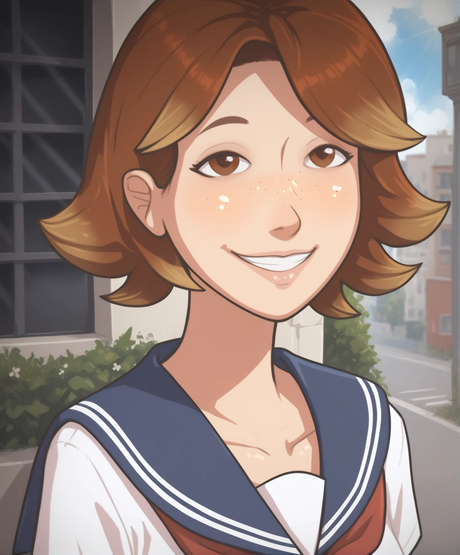Character: 1girl, solo, lucile, brown hair, brown eyes, collarbone, freckles, tanlines, gradient hair, medium breasts