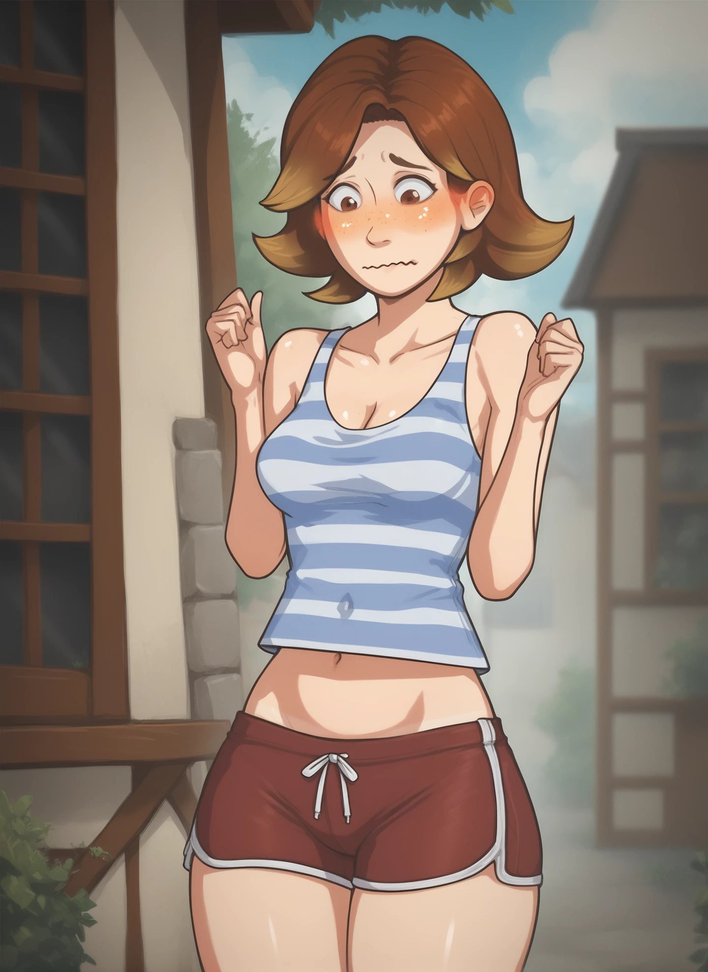 red shorts, striped shirt, cleavage, sleeveless shirt