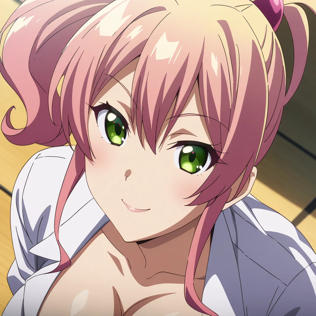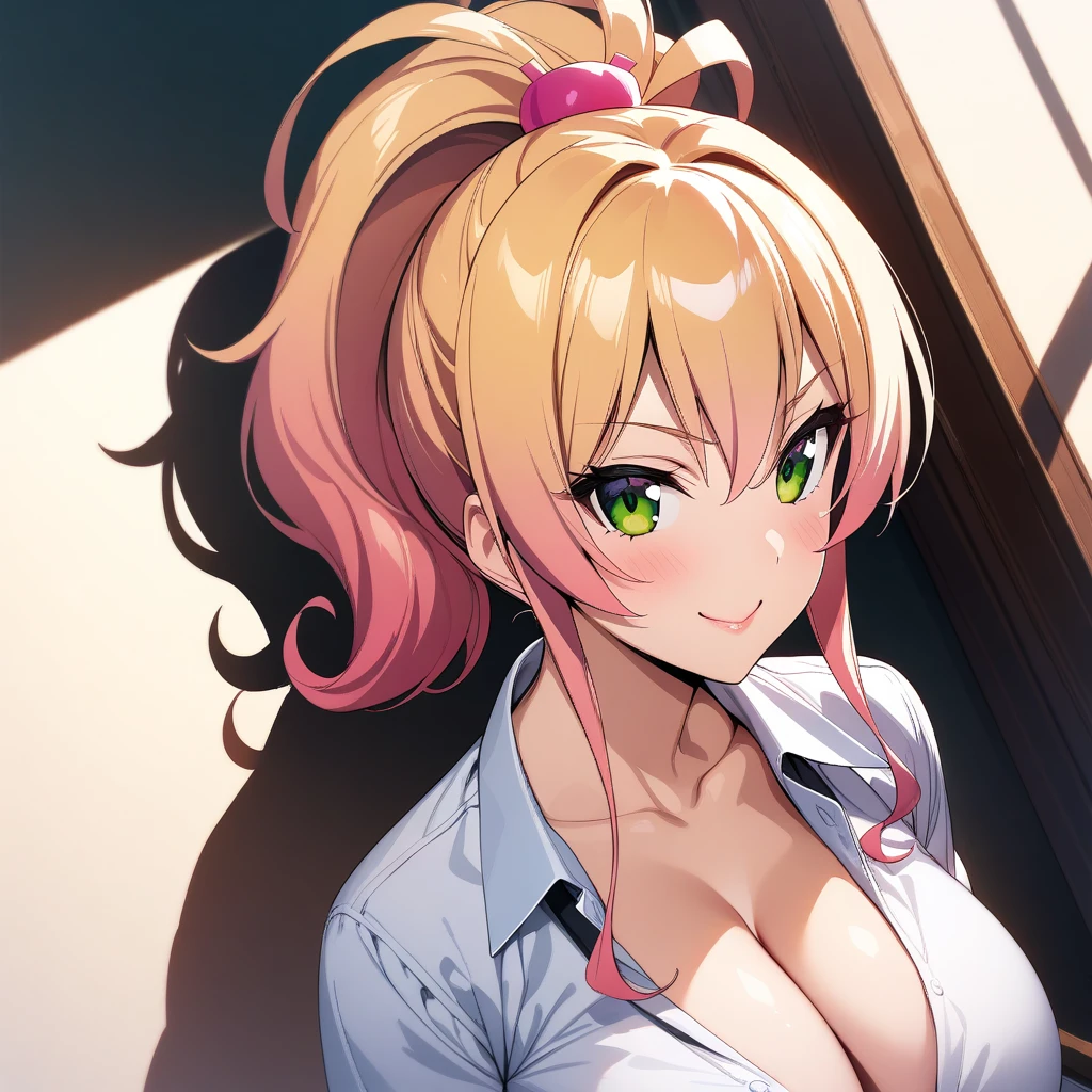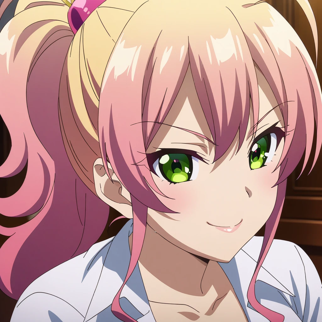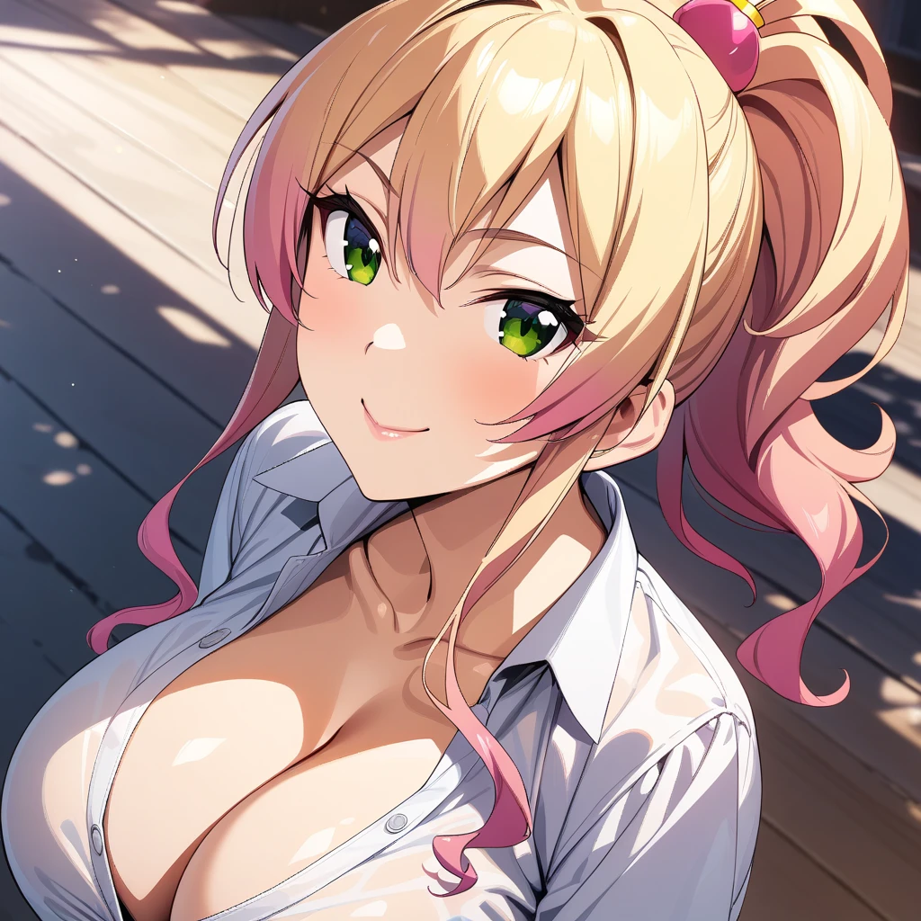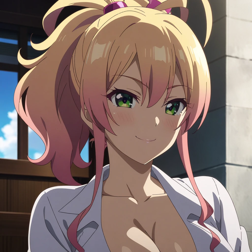 Activation tag is "yame_yukana,". Appearance tag is "blonde hair, green eyes, hair ornament, ponytail, large breasts, " Outfit tag is "white shirt, cleavage, blue ribbon necktie, green skirt, pleated skirt, loose socks, brown shoes"