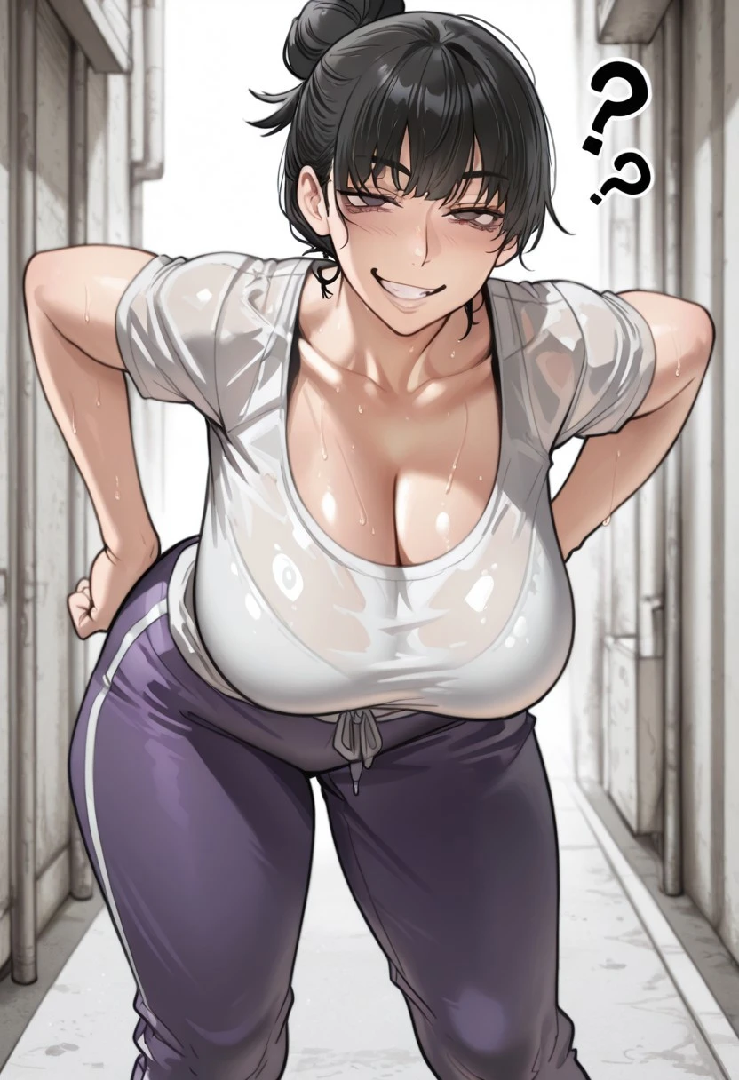 1girl, asa_mitaka_mom, milf, mature female, single hair bun, black hair, messy bangs,
