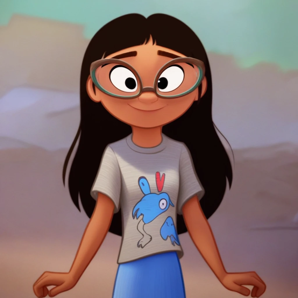 abbey, dark brown hair, long hair, glasses, black eyes, print shirt, skirt