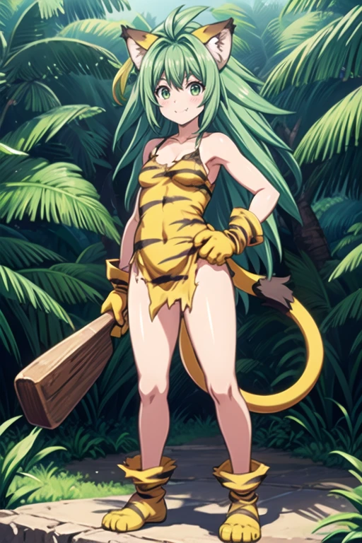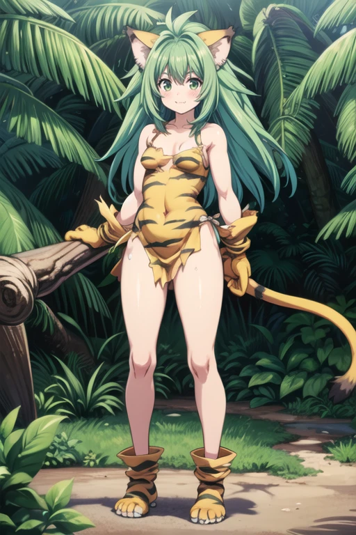 animal ears,gloves,animal hands,tiger print,animal print,tail,green hair,1girl,paw gloves,long hair,cat ears,green eyes,solo,paw shoes,shoes,fang,blush,looking at viewer,small breasts,smile,tiger ears,jungle background,tiger tail,tiger girl,cat tail,bare shoulders,solo focus,torn clothes,jewelry