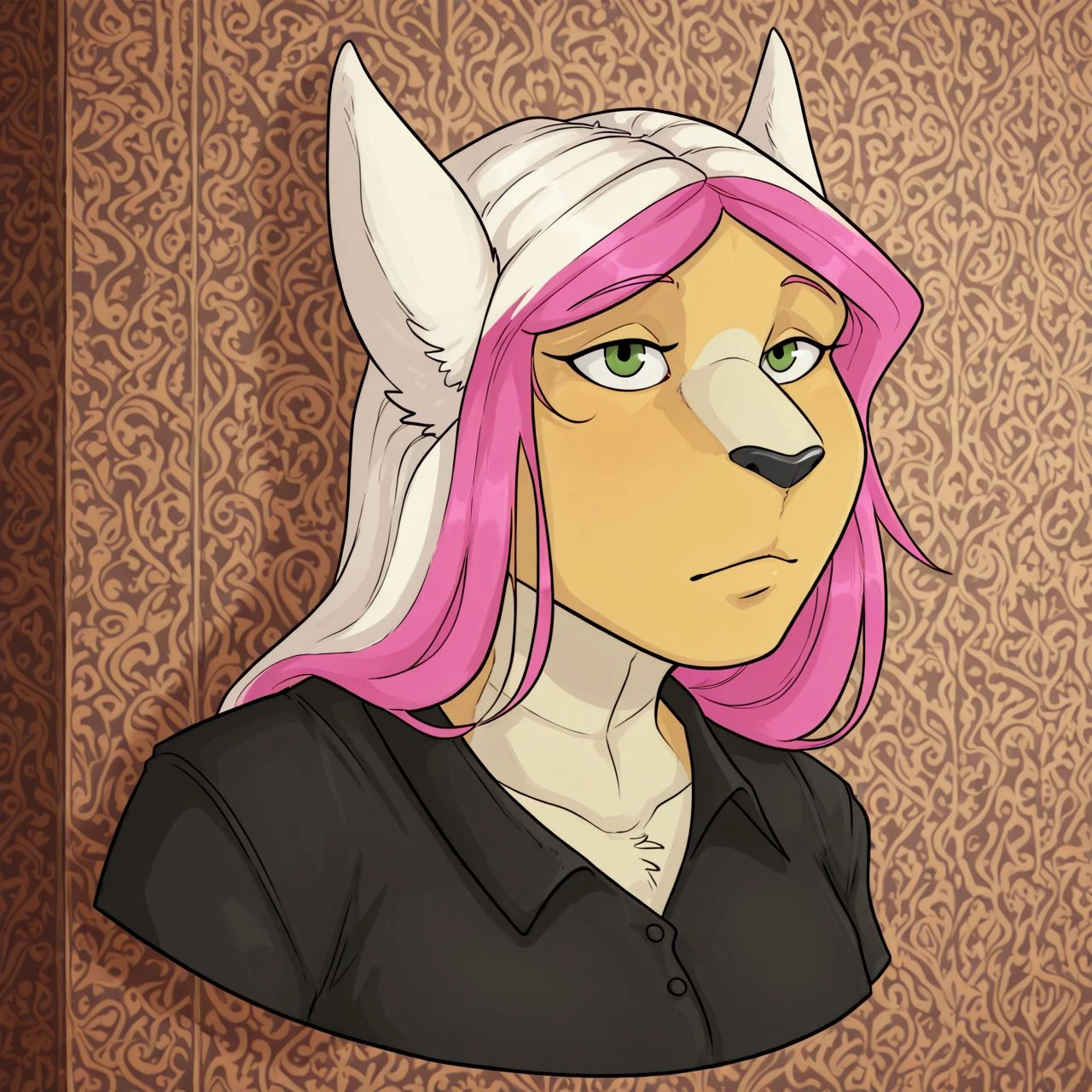 tracy_fenris49,drag0n_fenris49,, humanoid, furry,colored skin, two tone hair, pink hair, white hair, yellow skin, animal ears, long hair, tail, black nose, countershade torso,