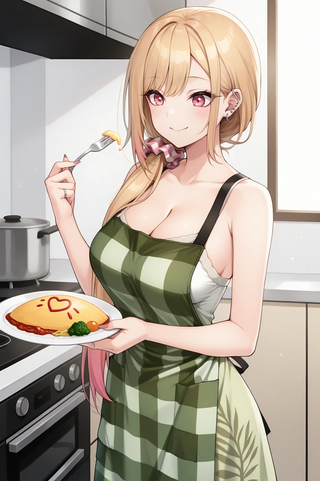 ring, low ponytail, hair scrunchie, green apron, checkered apron, bare shoulders, sleeveless dress, print dress, spaghetti strap, cleavage