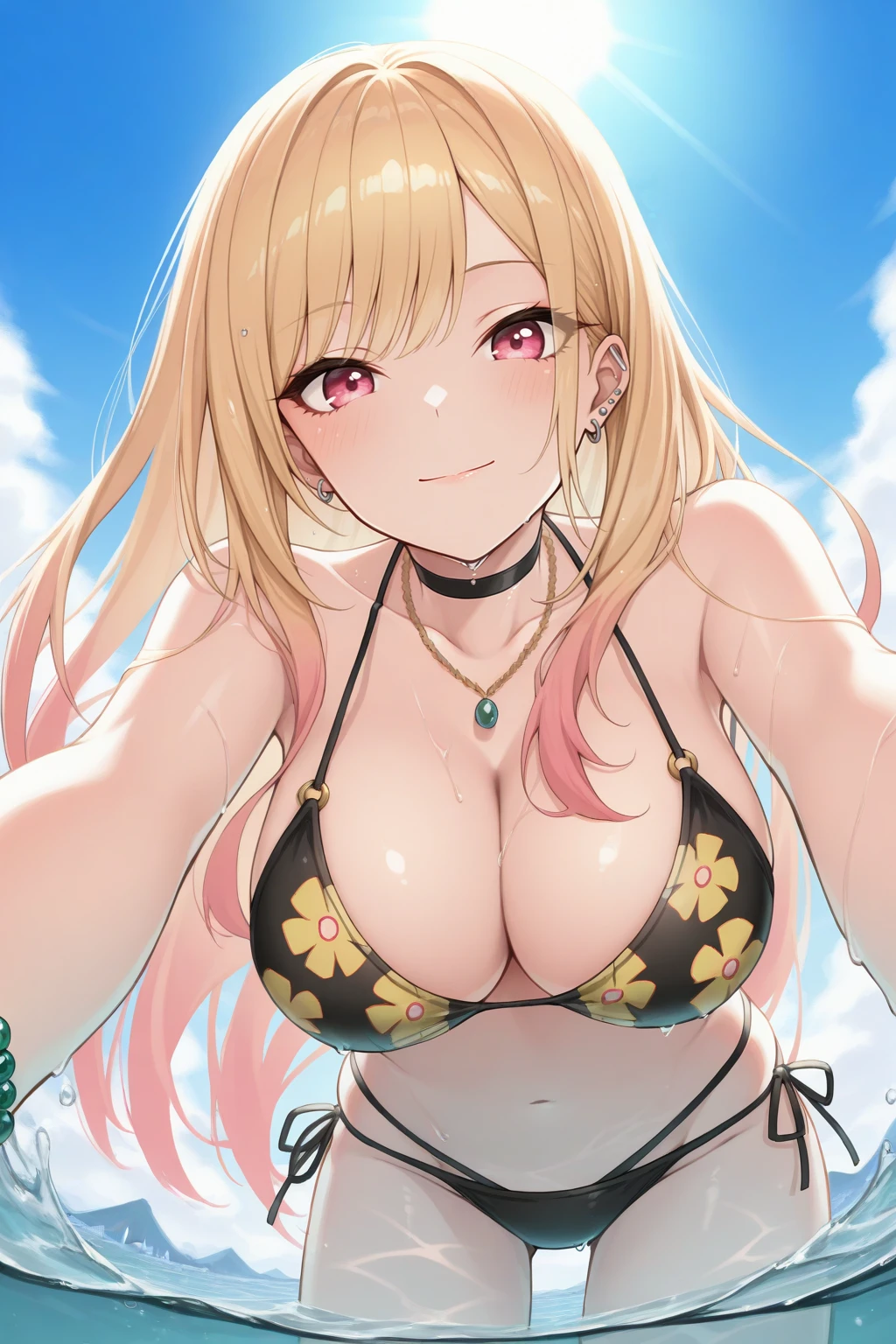 bead bracelet, bracelet, ring, black choker, necklace, black bikini, floral print bikini, black bikini, multi-strapped bikini bottom, side-tie bikini bottom