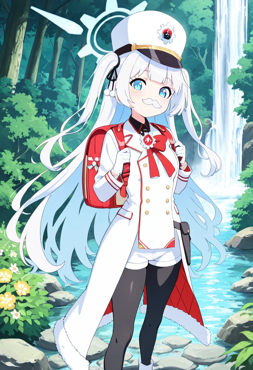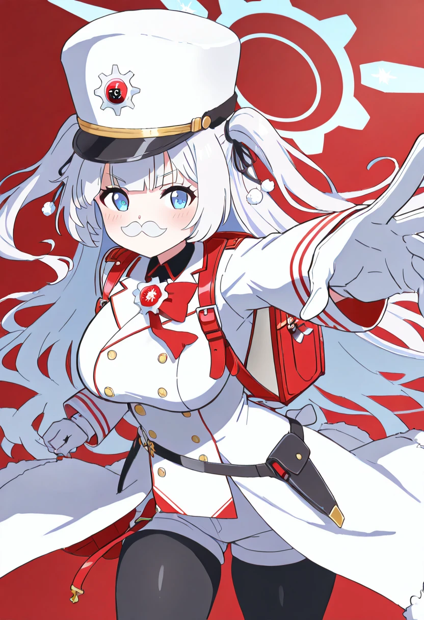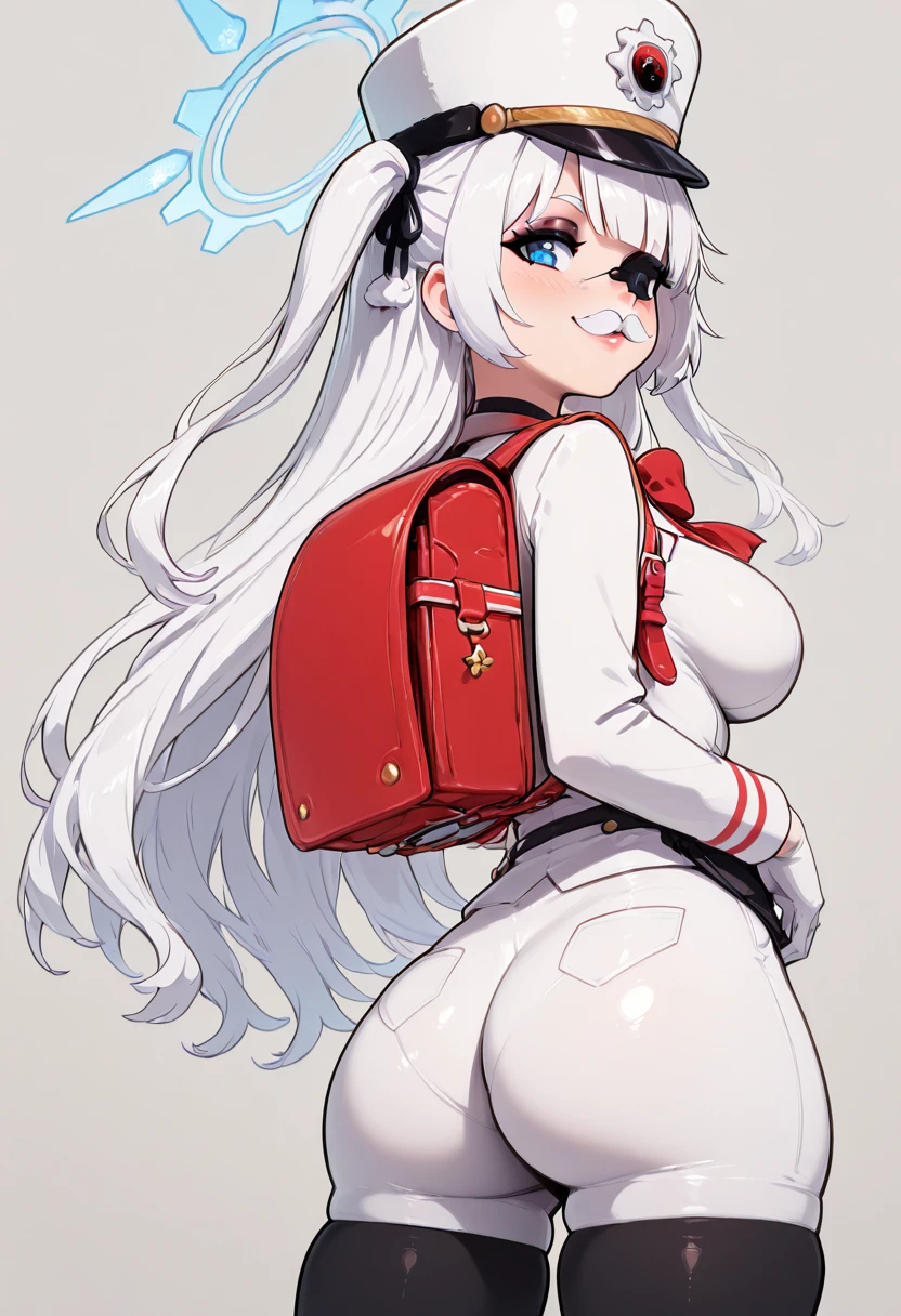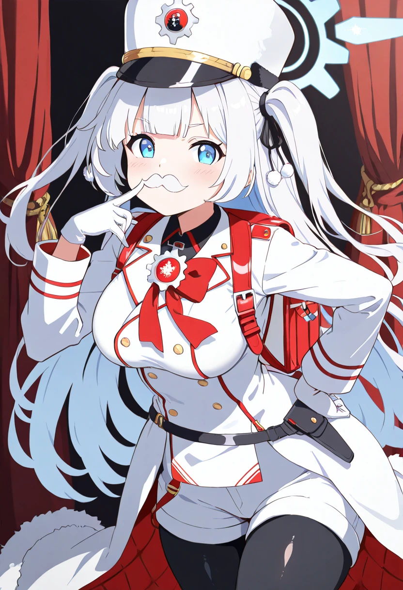zzCherino, blue eyes, white hair, long hair, two side up, halo, aged up, large breasts, ribbon, shako cap, fake mustache white coat, white shorts, white gloves, black pantyhose, randoseru (backpack), pom-pom hair ornament ,