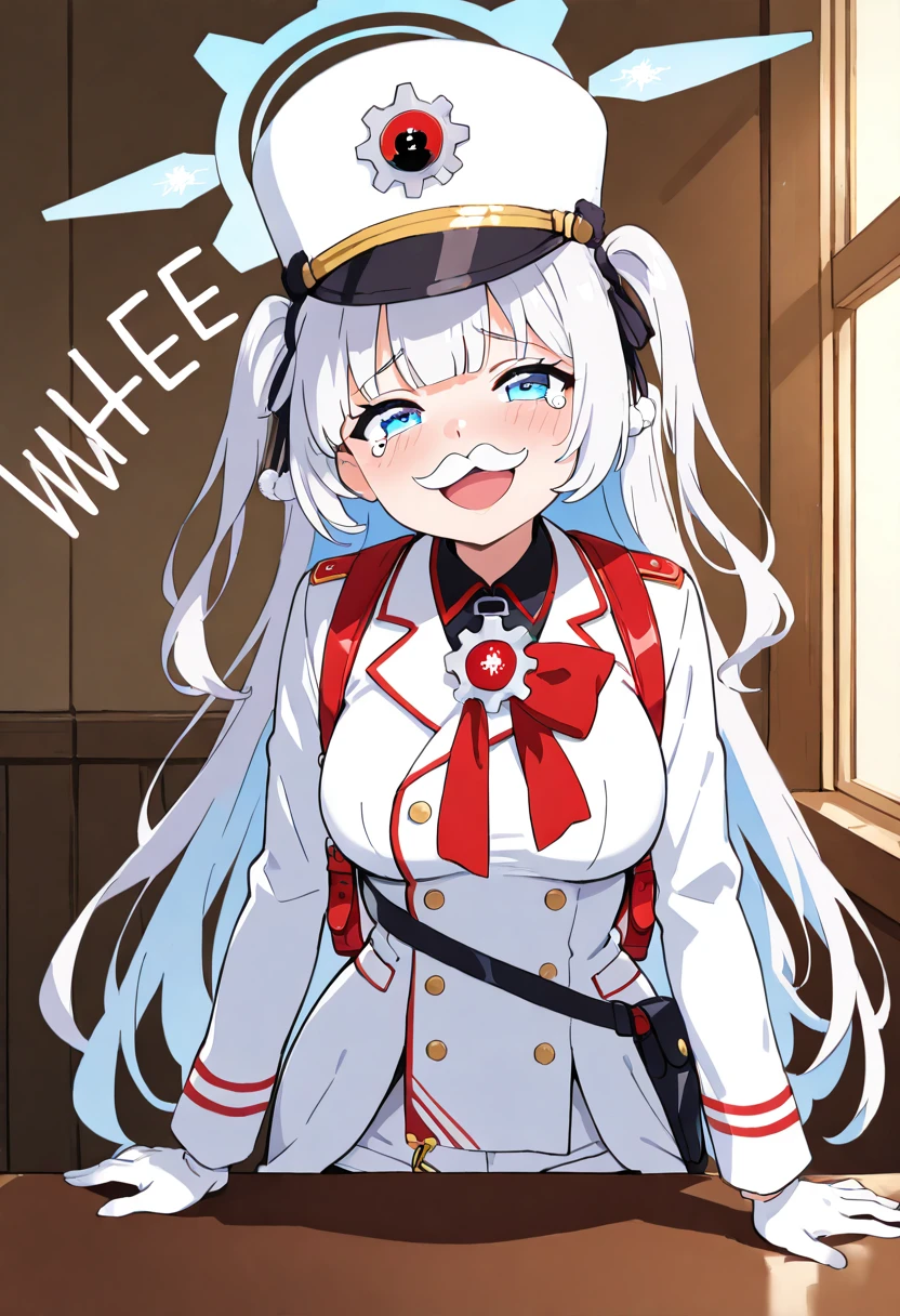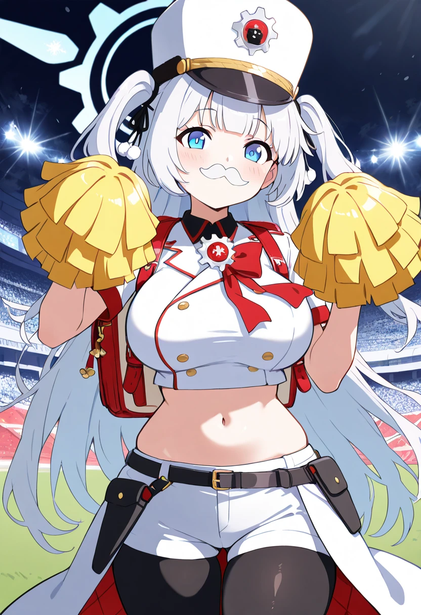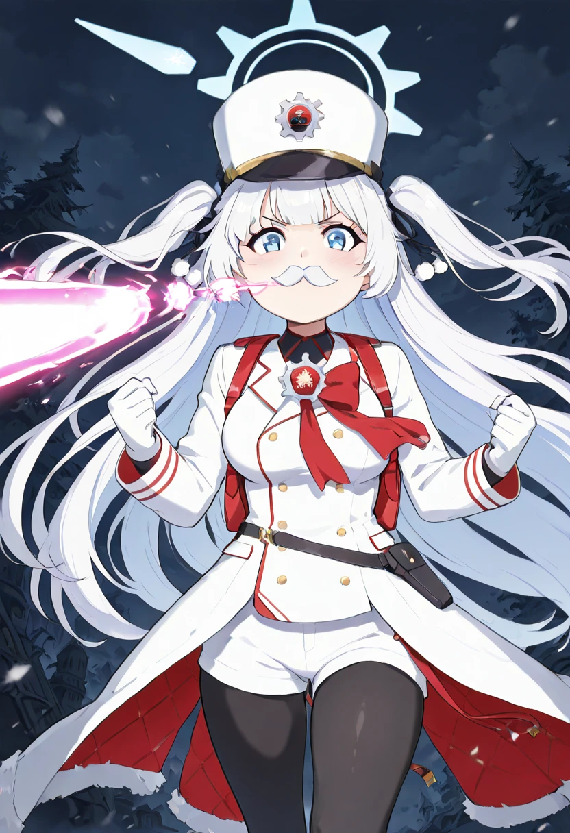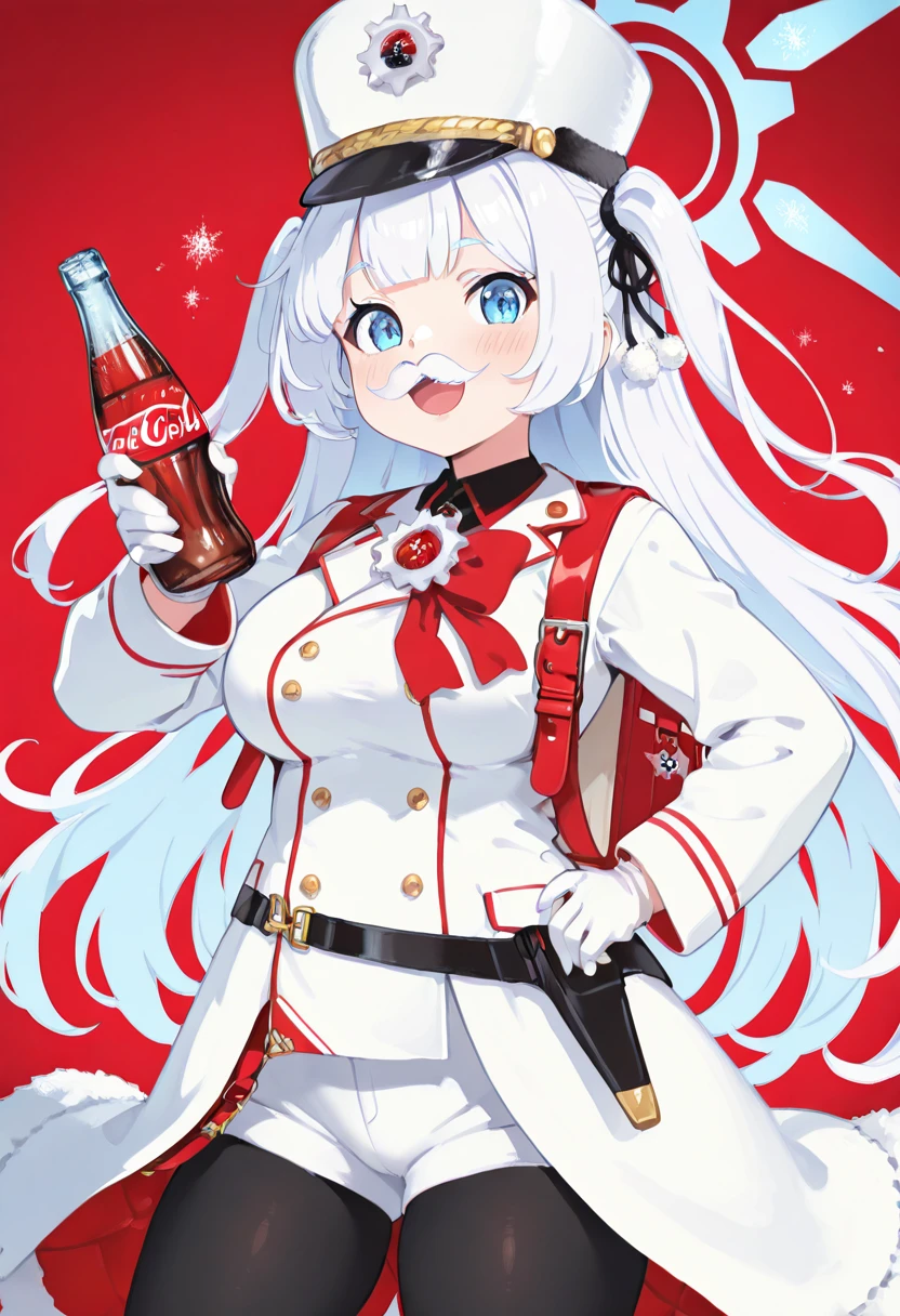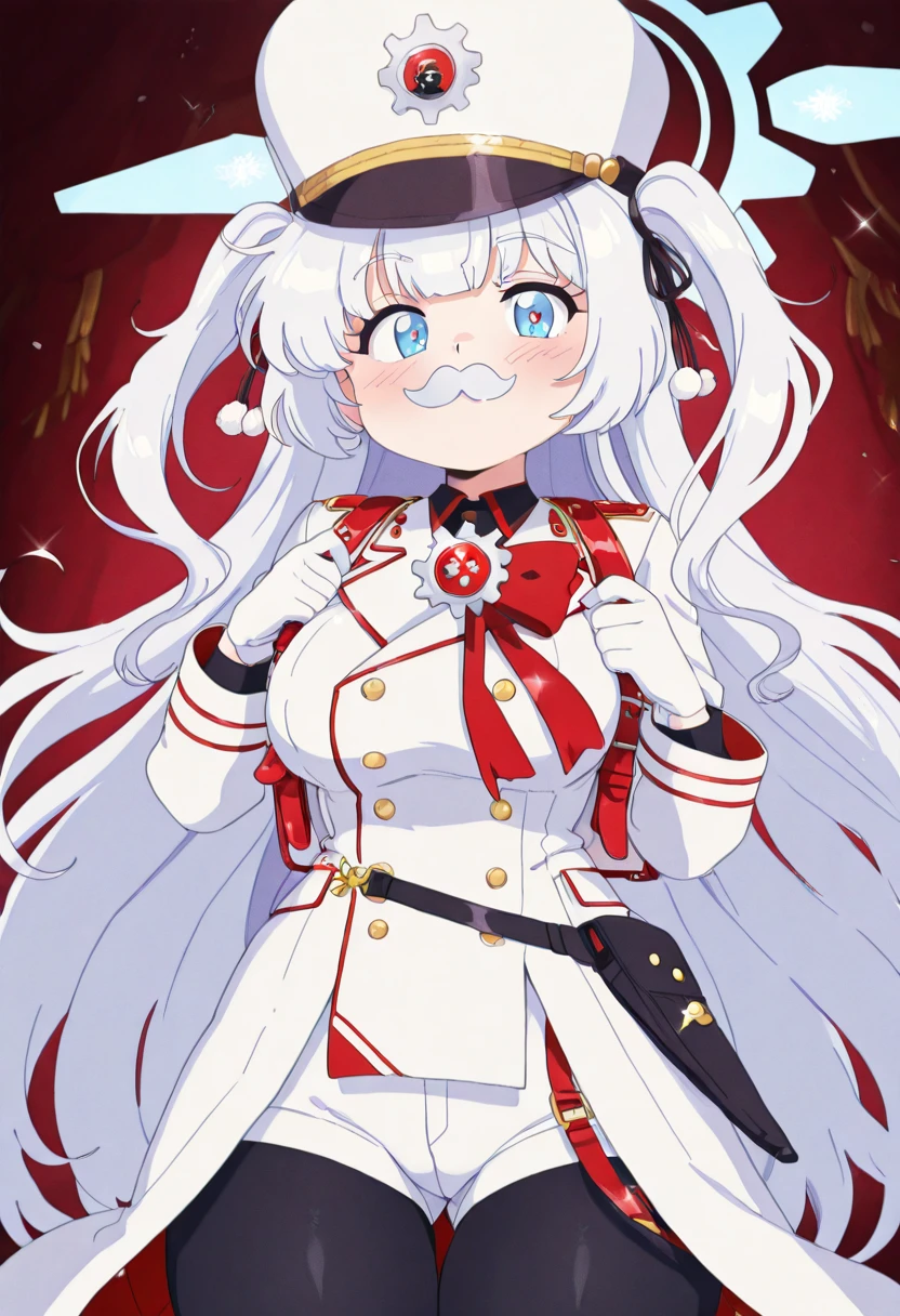 zzCherino, blue eyes, white hair, long hair, two side up, halo, aged up, large breasts, ribbon, shako cap, fake mustache white coat, white shorts, white gloves, black pantyhose, randoseru (backpack), pom-pom hair ornament ,