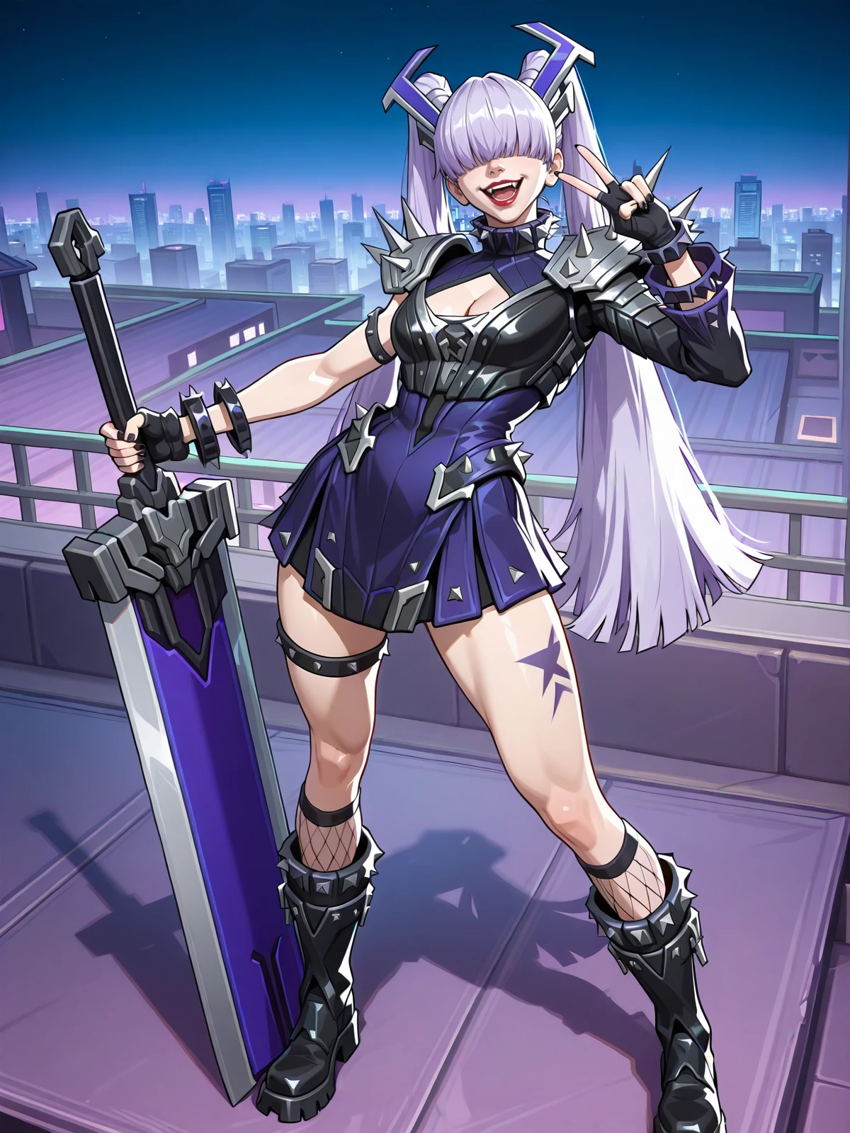 black nails, fingerless gloves, cleavage cutout, spiked collar, single sleeve, long sleeve, spikes, bracelet, shoulder armor, pauldrons, purple dress, short dress, thigh strap, leg tattoo, fishnet socks, knee boots