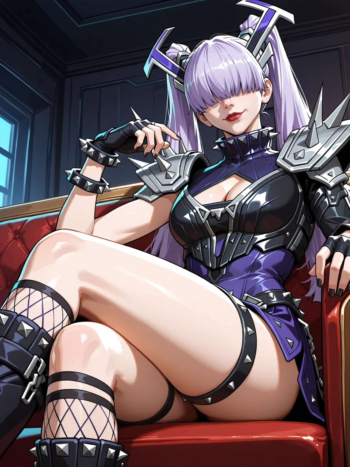 twintails, purple hair, blunt bangs, hair over eyes, horned headwear, covered eyes, red lips, chin guard
