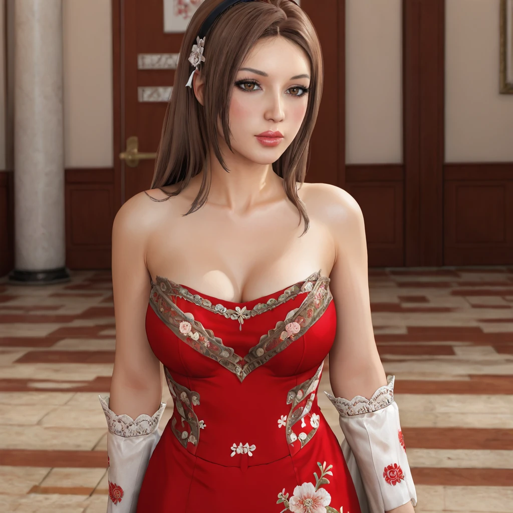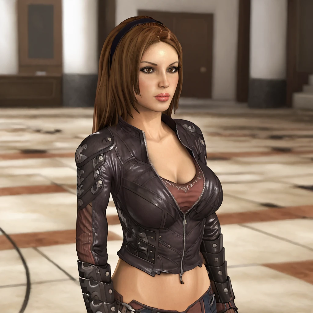 • Trigger : TaliaAlGhulArkhamCity, 1girl, midriff, large breasts, leather, makeup, long hair, brown hair, hairband, brown eyes, gloves, denim, cleavage, navel, jeans, pants, unzipped, lips, cowboy shot