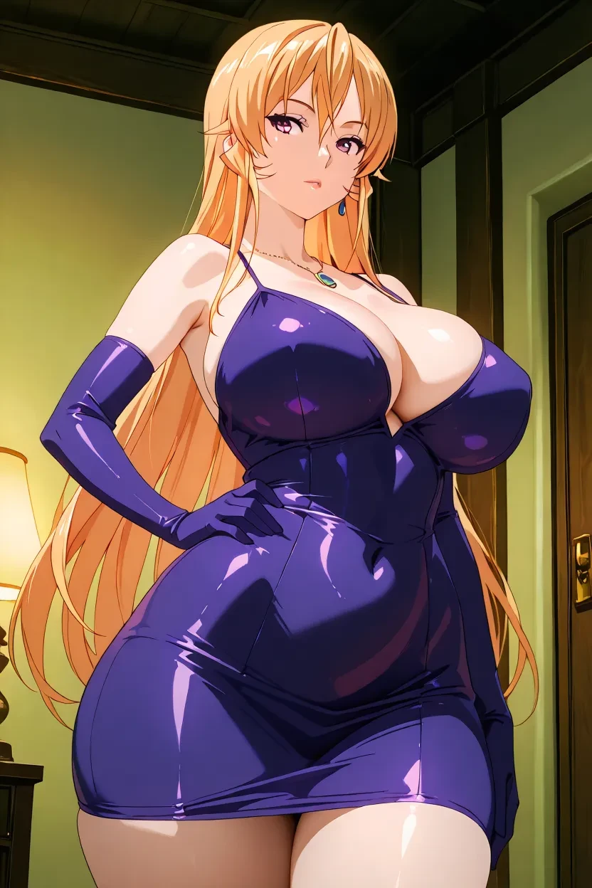 1girl, Erina Nakiri (Food Wars!), blonde_ hair, long_hair, purple_eyes, lips, huge_breasts, sexy, curvy, wide hips, thick thighs, , fully , , , food_wars_art_style, 4k, HD, superb_quality