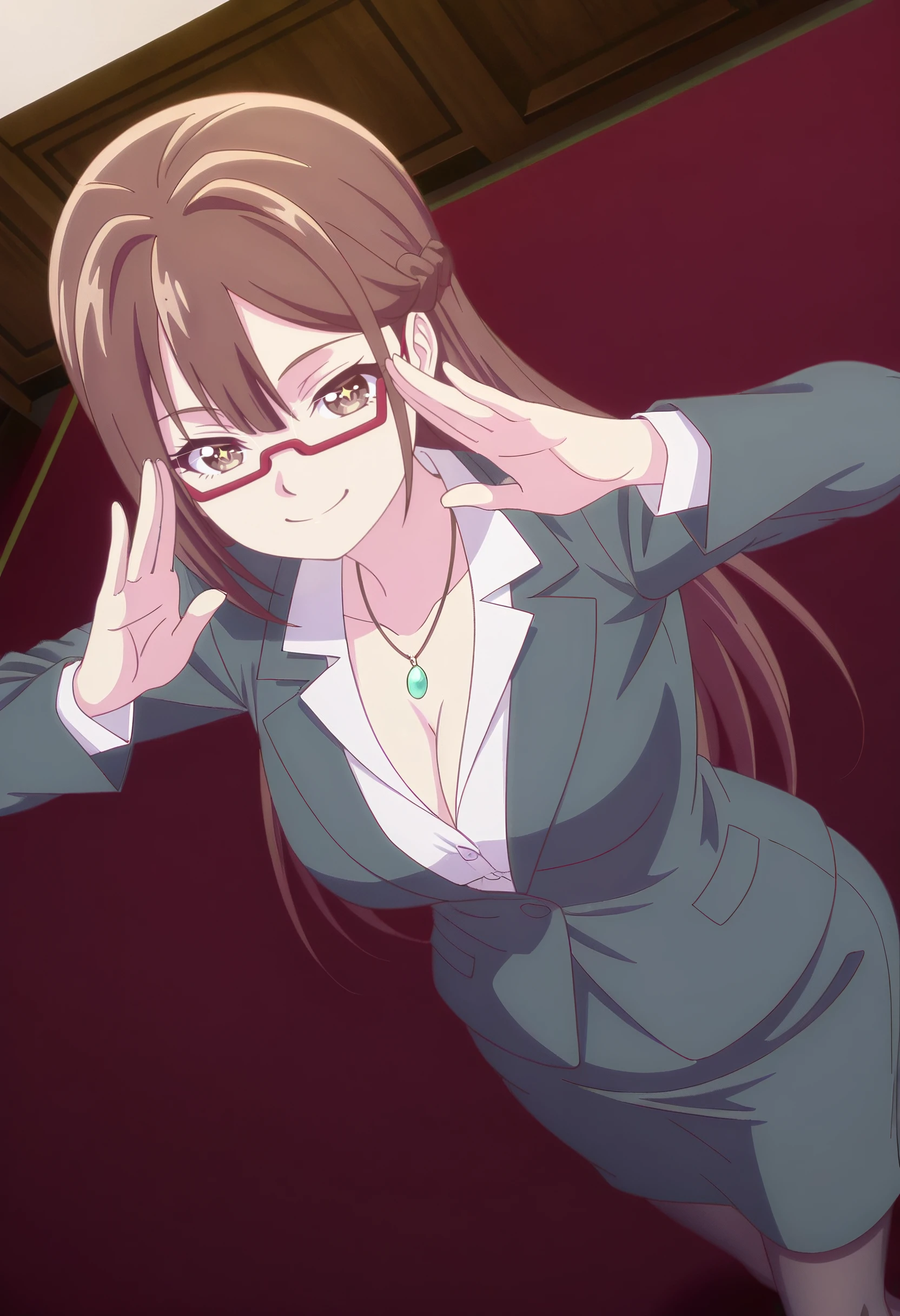 MirandaOutfit, black jacket, necklace, formal clothes, jewelry, white shirt, skirt suit, office lady, cleavage, blazer, long sleeves, black skirt, pencil skirt, collared shirt, black pantyhose,