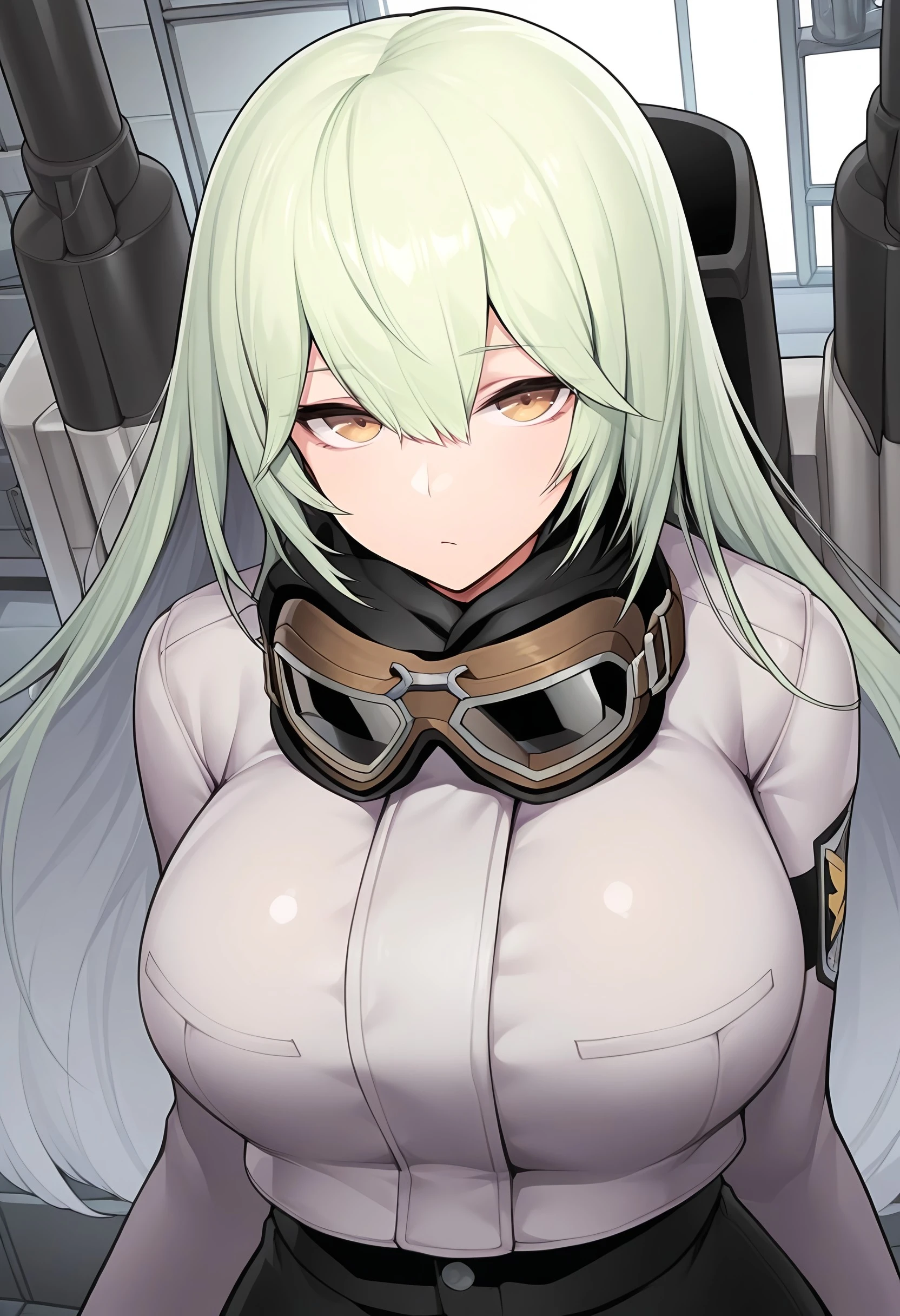 baseshee, jacket, thighhighs, goggles, goggles around neck, long hair, skirt,