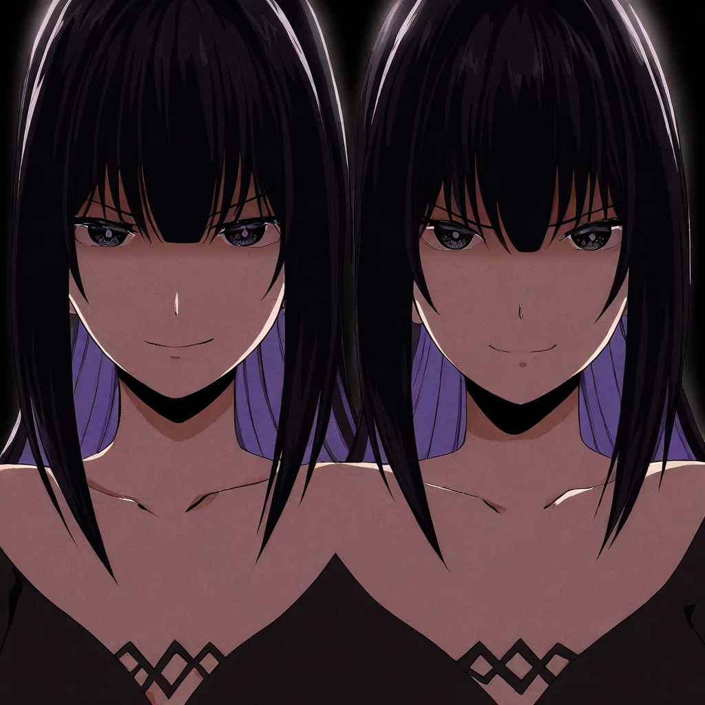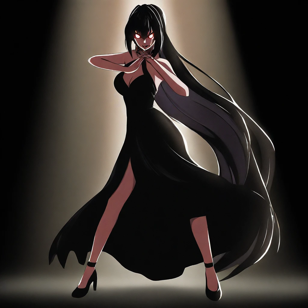 Appearance: long black hair, sharp and confident eyes, elegant black dress, feminine silhouette.
