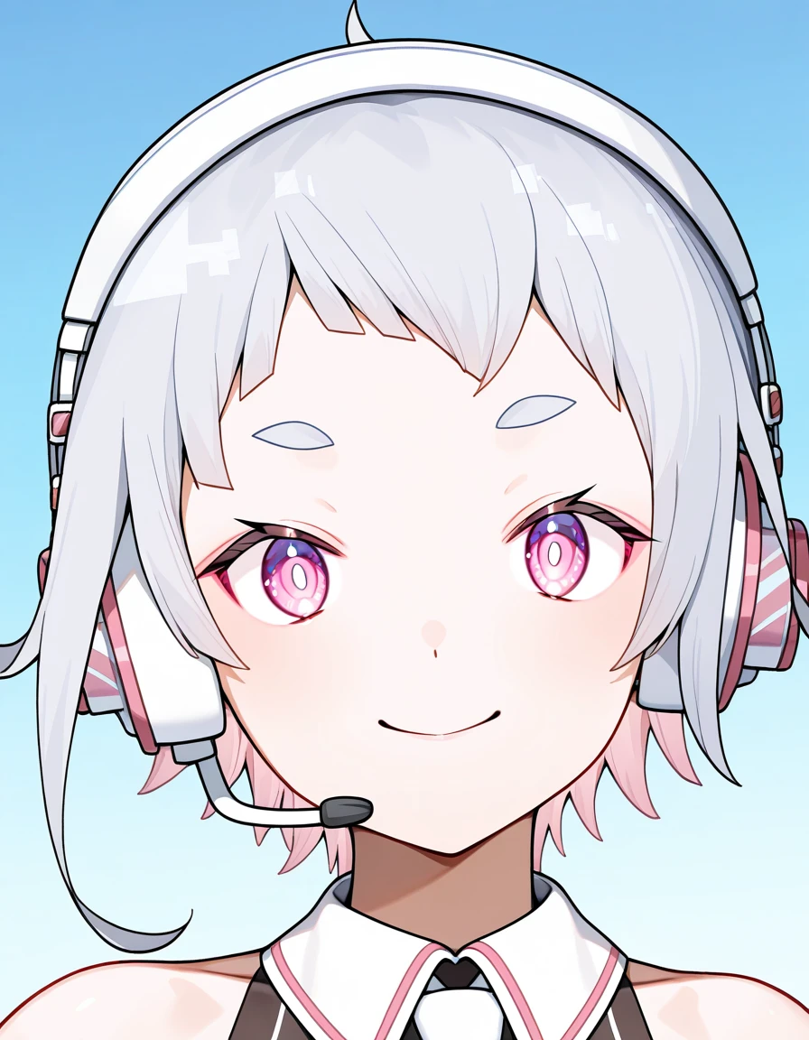 white pupils,medium breasts, single long sidelock, kishimen hair, lower lip only, grey hair, short hair, cowlick, short eyebrows, thick eyebrows, pink eyes, 装備