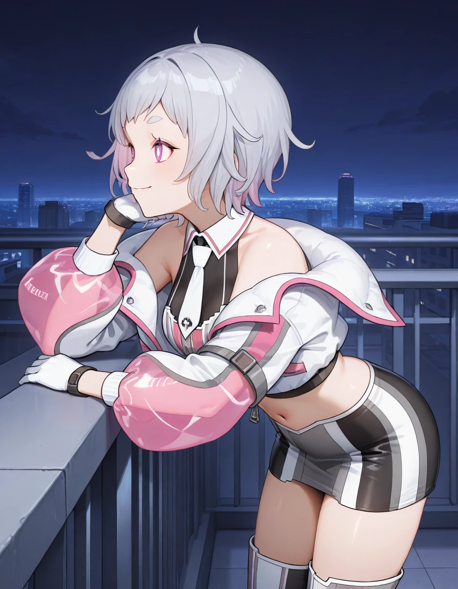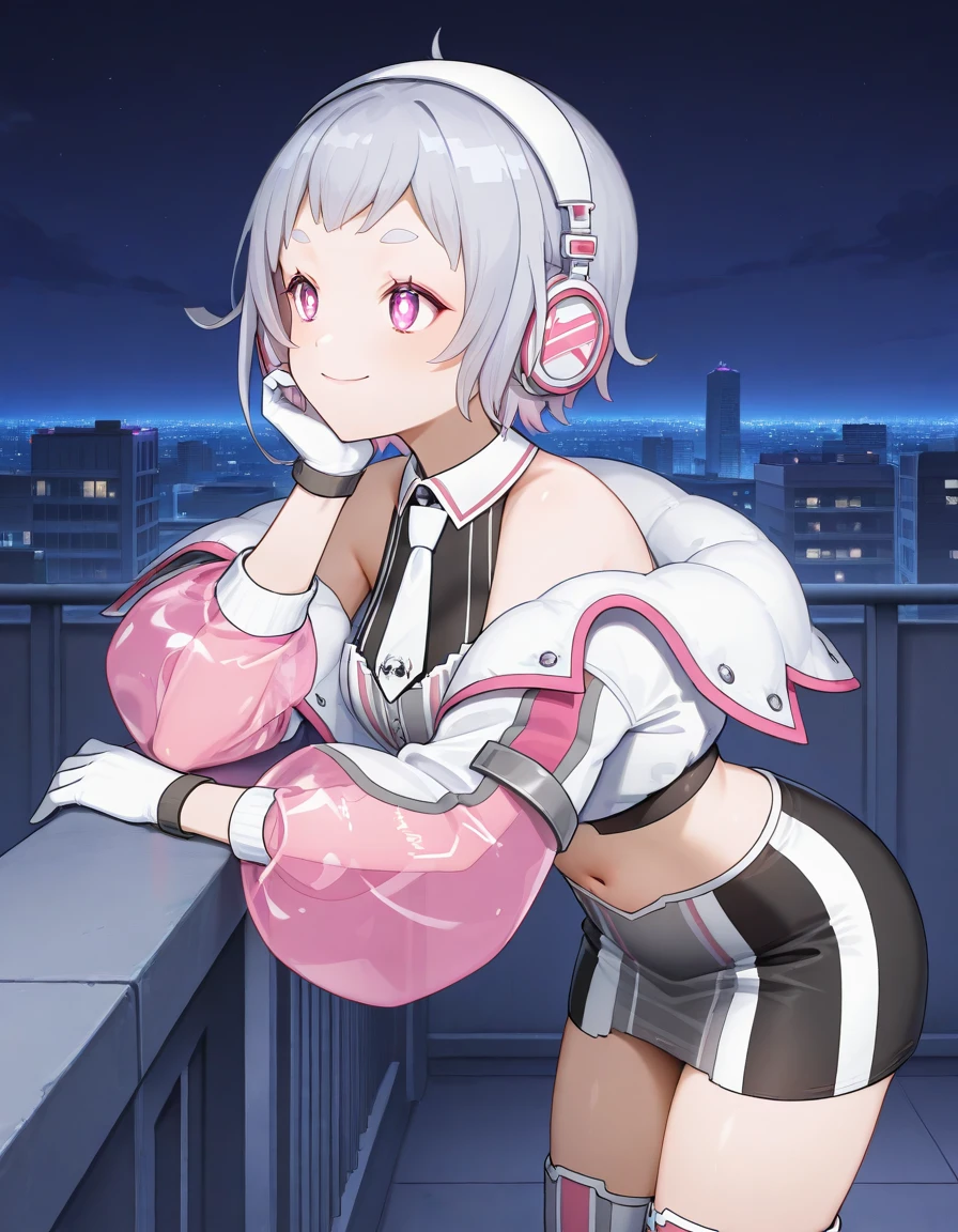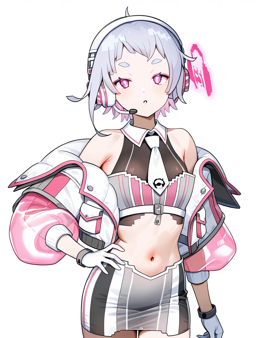 OutfitRegularLnkGCFP, bare shoulders, black sleeveless shirt, multicolored bodice, zipper pull tab, white necktie, white chest belt underbust, white jacket puffy sleeves, pink see-through sleeves, open jacket, off shoulder, white gloves, navel, miniskirt, thigh boots, 生成が不??なら追加してみてください。