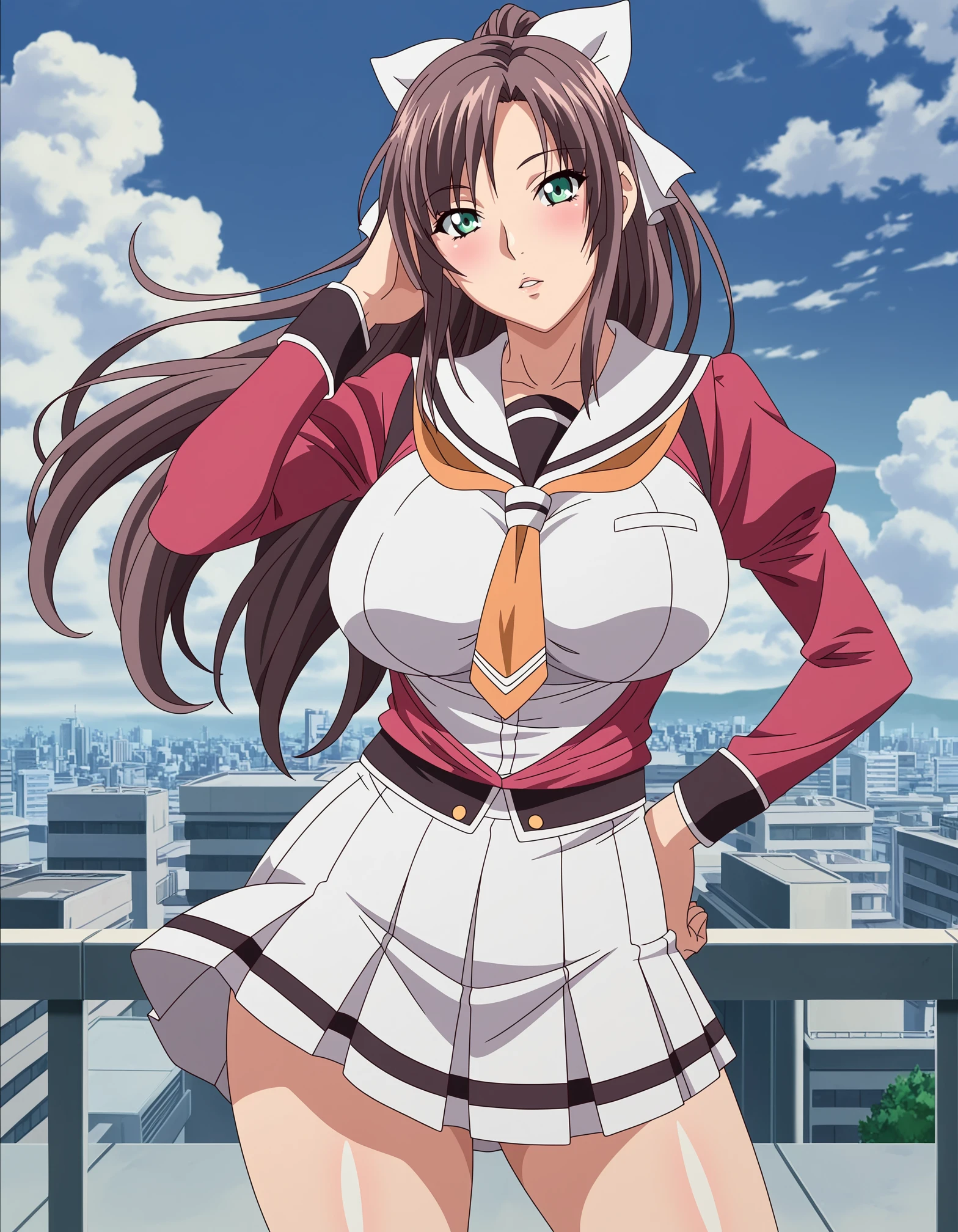 Toudou Erika, 1girl, brown hair, long hair, green eyes, hair bow, ponytail