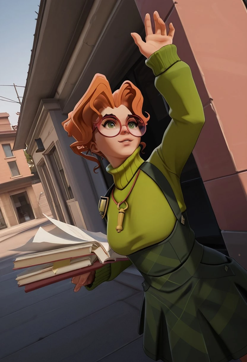 orange hair, green eyes, glasses