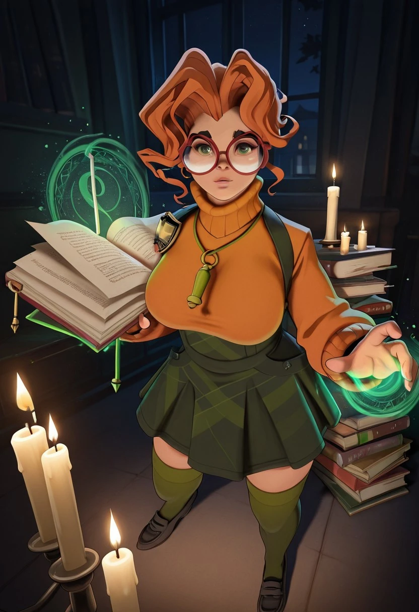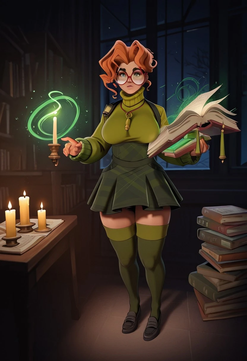 thigh highs, green sweater, turtleneck, skirt, green socks