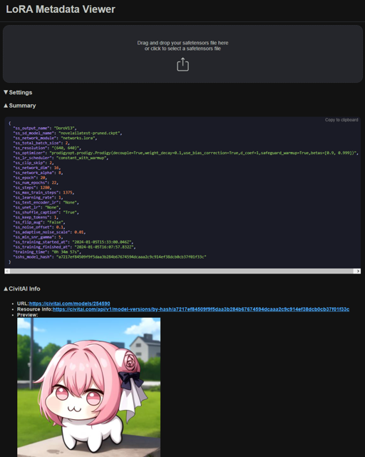 Single file pure HTML tool for viewing LoRA metadata that can be run locally on your web browser without the need of installation or internet connectivity.