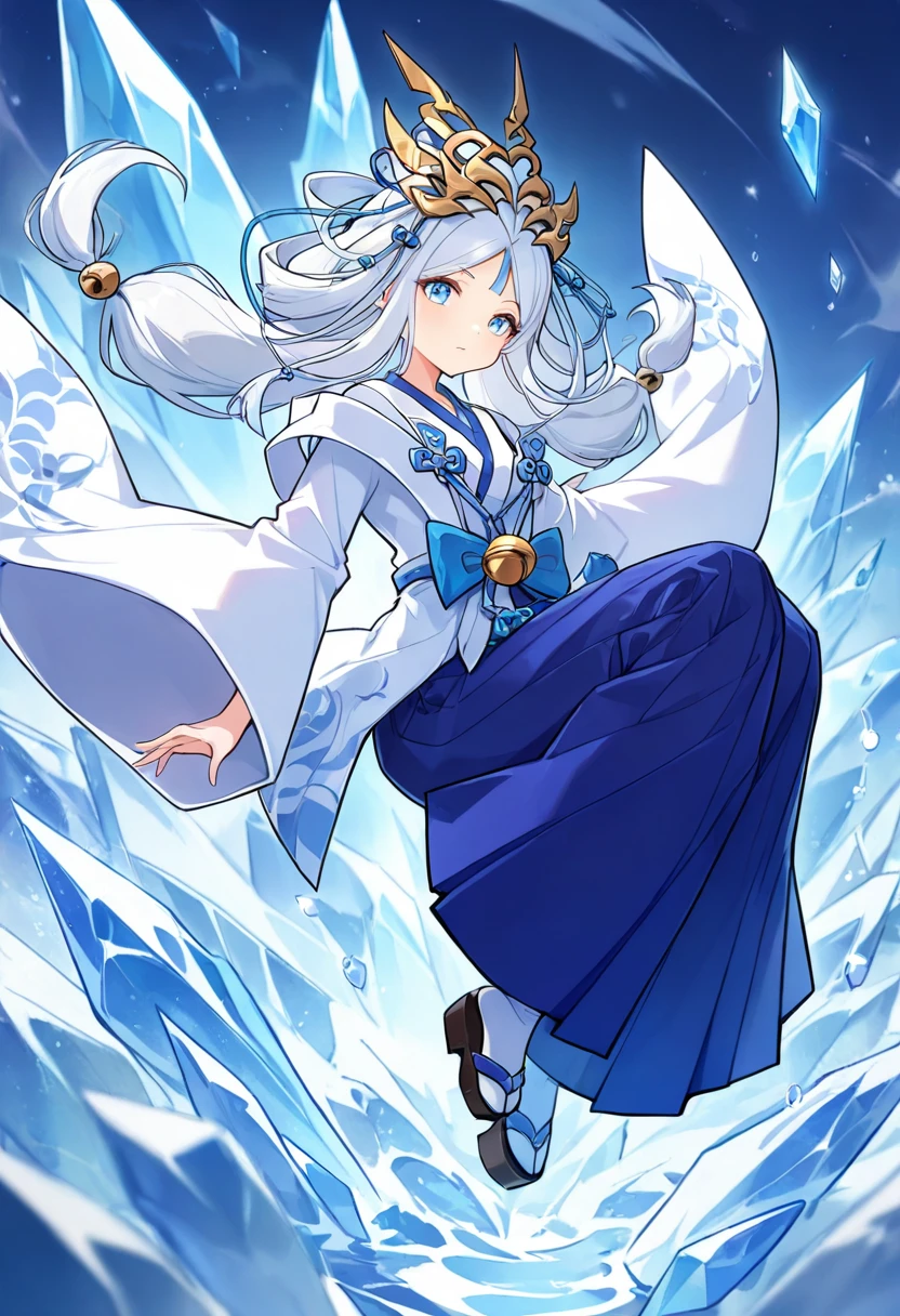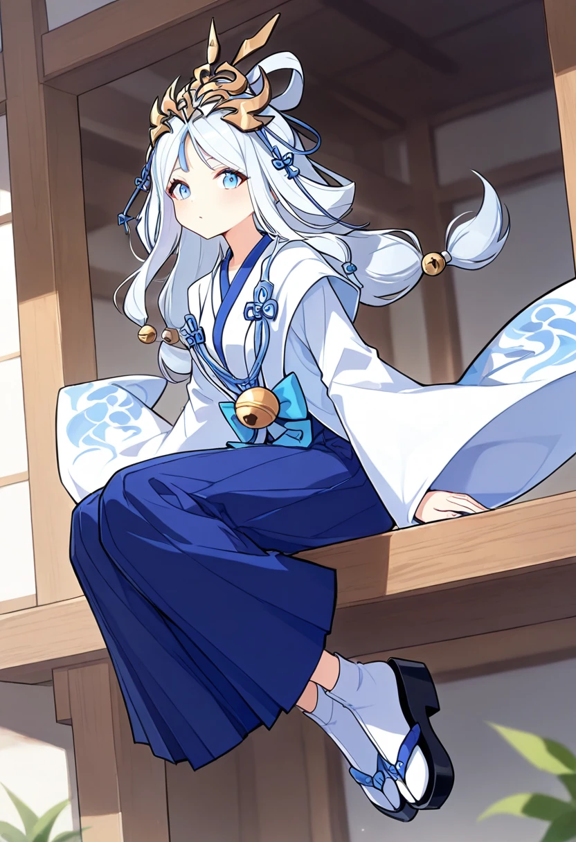 qiong,1girl,solo,blue eyes,white hair,long hair,low twintails,low-tied long hair,parted bangs,sidelocks,hair ornament,hair rings,headdress,blue bow,white kimono,white shirt,haori,long skirt,blue skirt,hakama skirt,long sleeves,wide sleeves,sleeves past wrists,bell,white socks,tabi,okobo,sandals,geta,