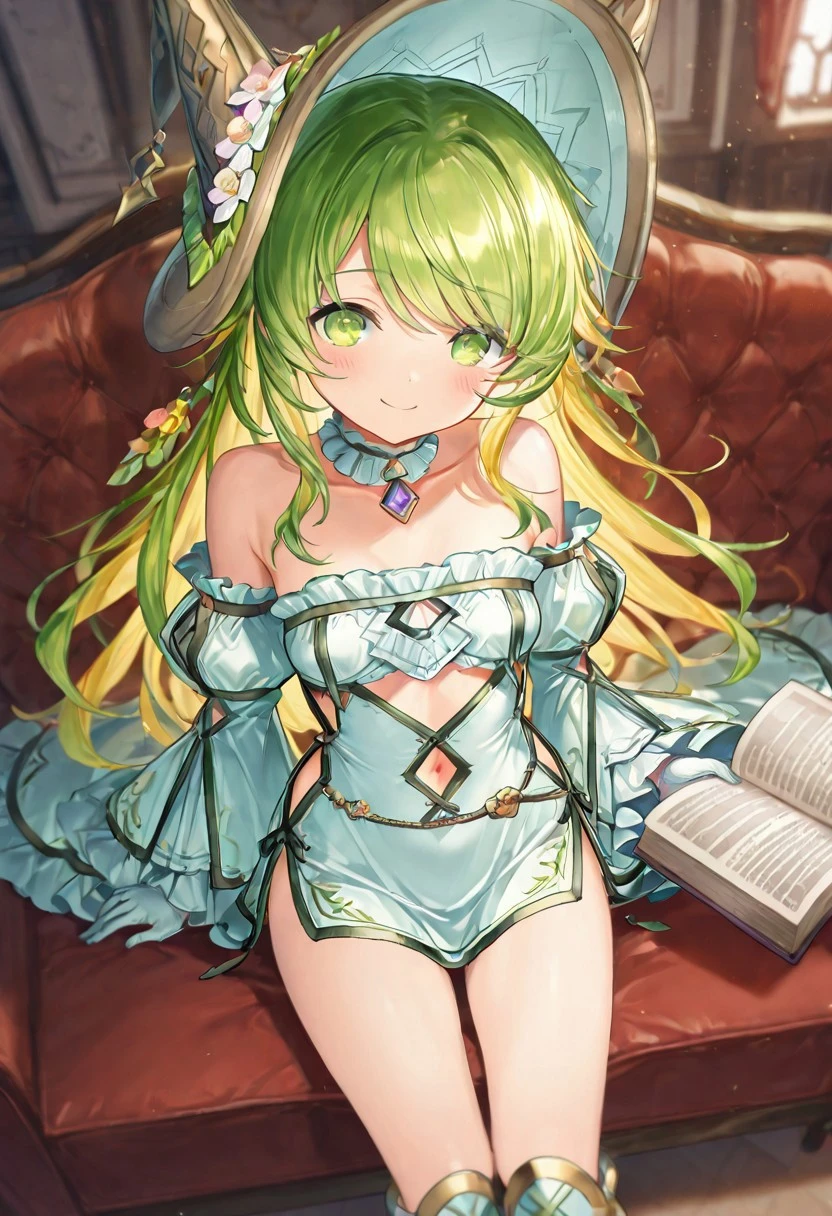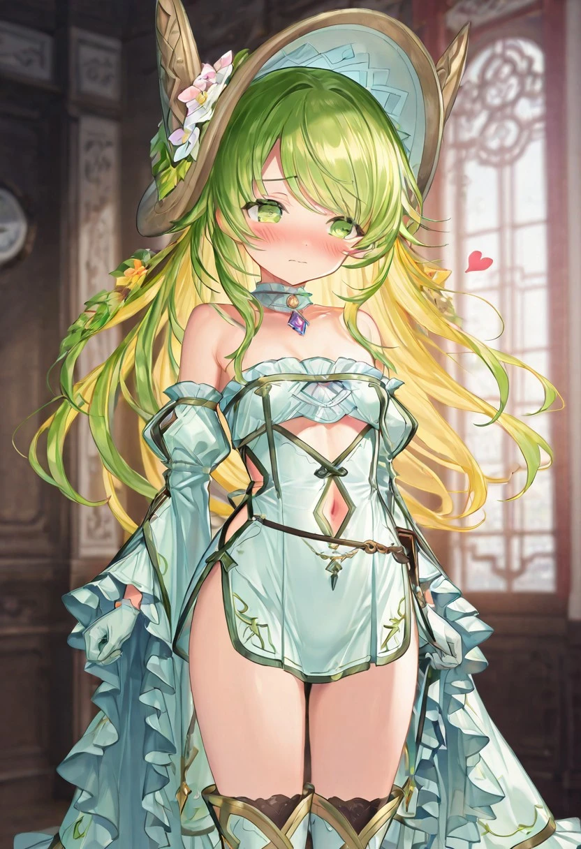 small breasts, slim body, short, two-tone hair, green hair, yellow hair, long hair, swept bangs, green eye,