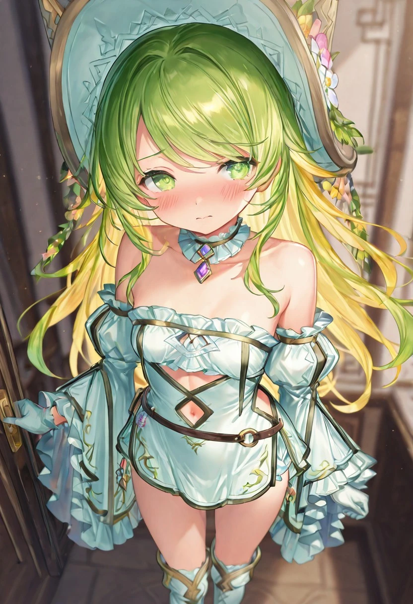 big hat, white dress, china dress, short dress, frilled dress, belt dress, gold trim, belt , belt buckle, dress cutout, cutout above navel, navel cutout, side cutout, pendant, bare shoulders, puffy detached sleeves, wide sleeves, frilled sleeves, ribbed sleeves, frilled choker, white gloves, white knee boots,