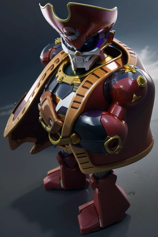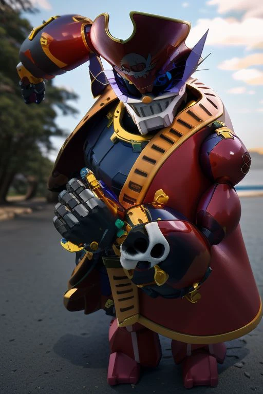 Captain Whisker, robot, white moustache, red pirate hat with golden hemline and the symbol of a white skull, brown baldric and belt with a gold buckle and tip