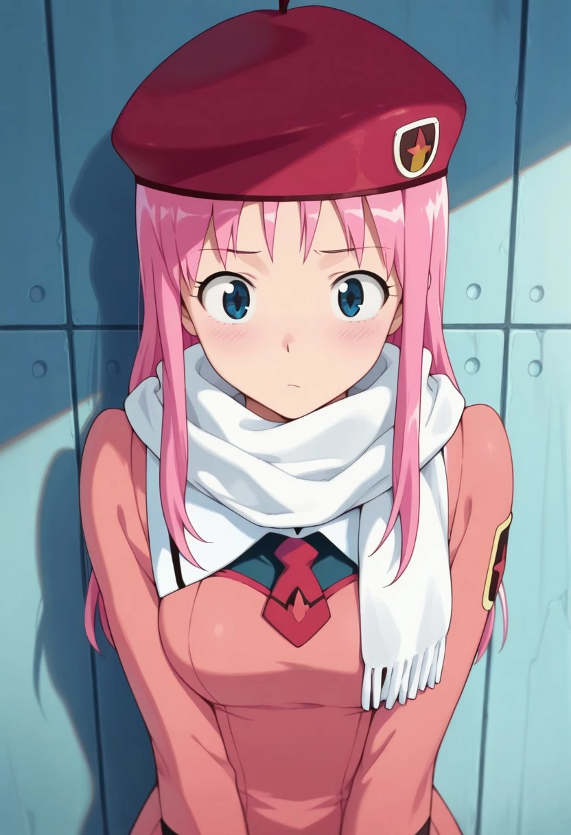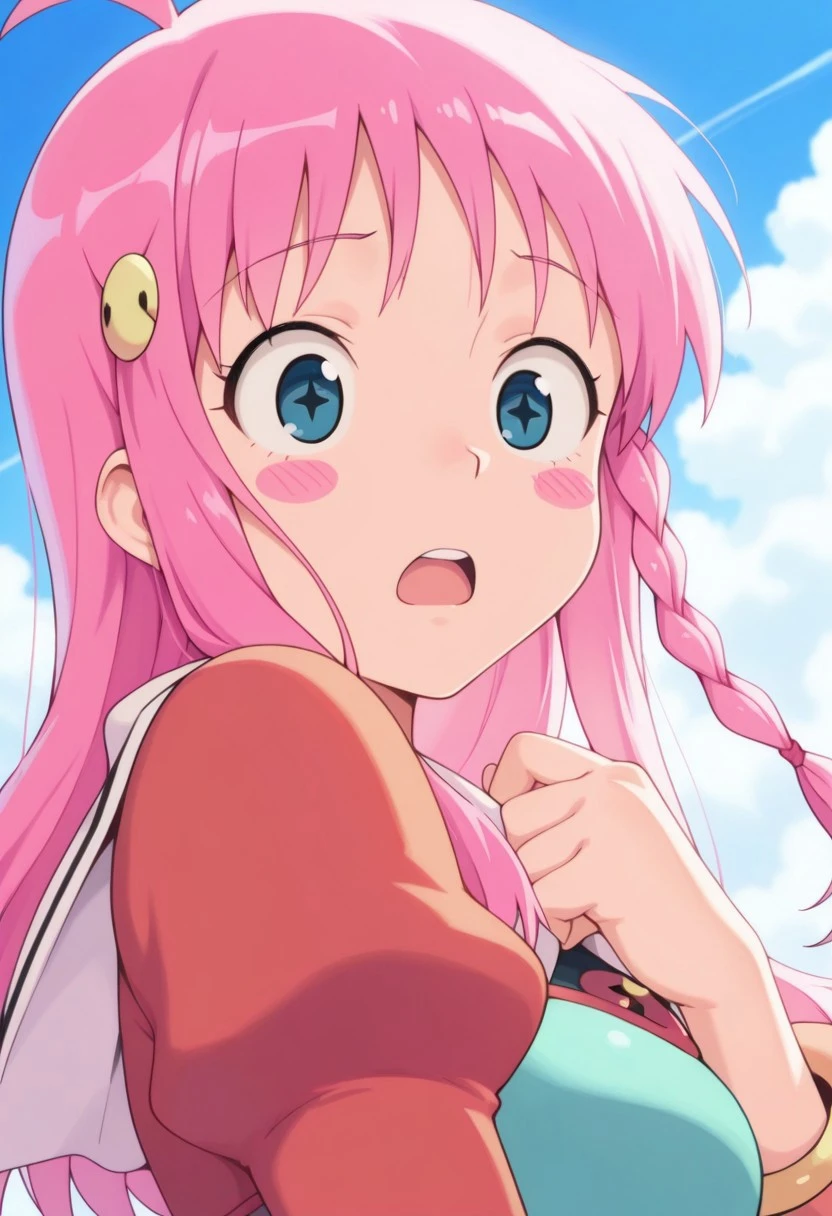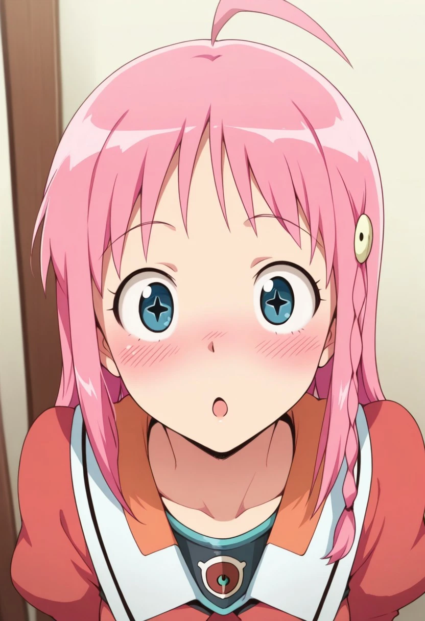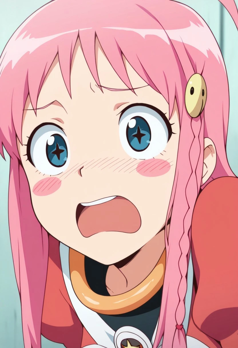 Normal appearance: nono, pink hair, blue eyes, symbol-shaped pupils, long hair