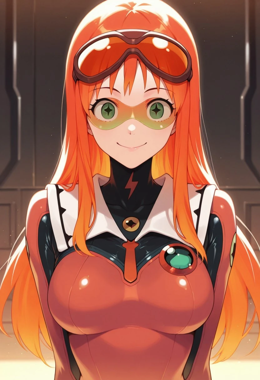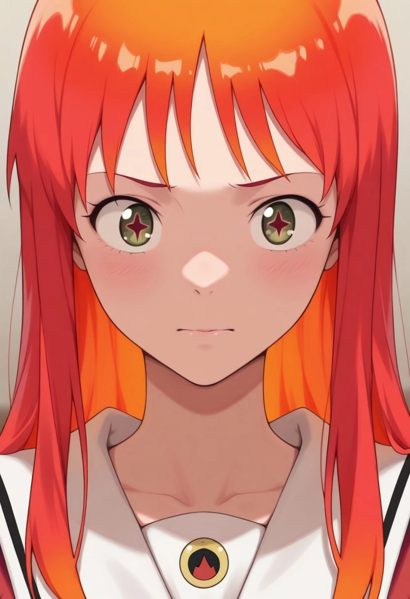 When she is Bluster Machine No.7: nono, orange hair, blue eyes, symbol-shaped pupils, long hair