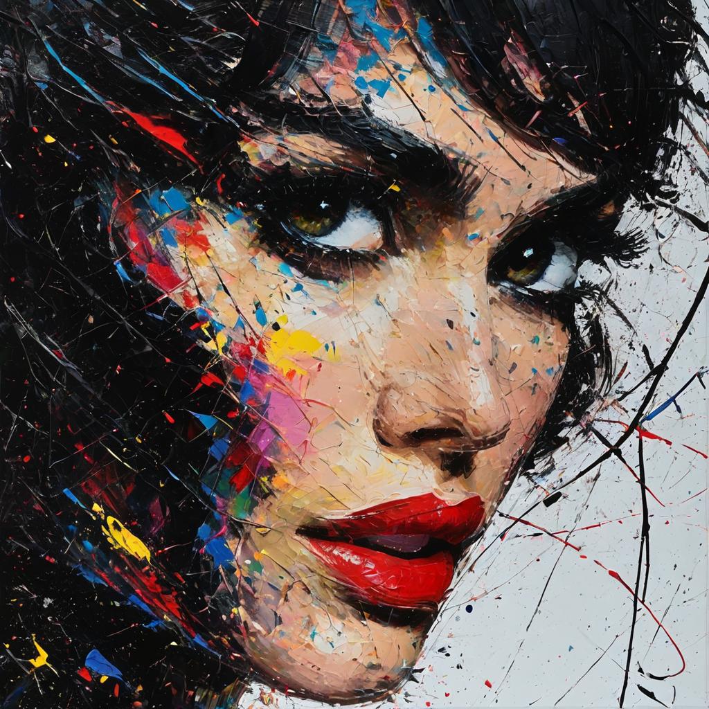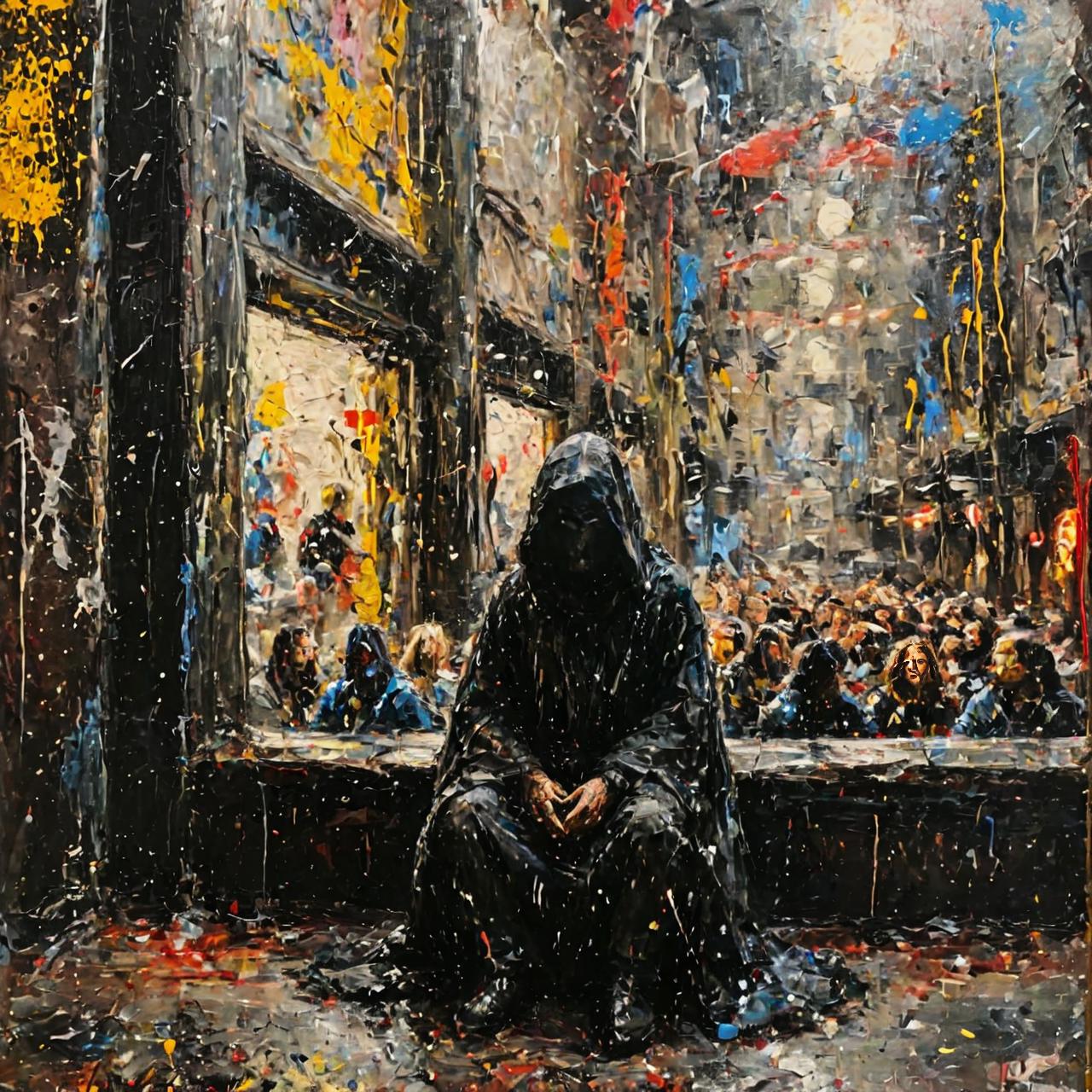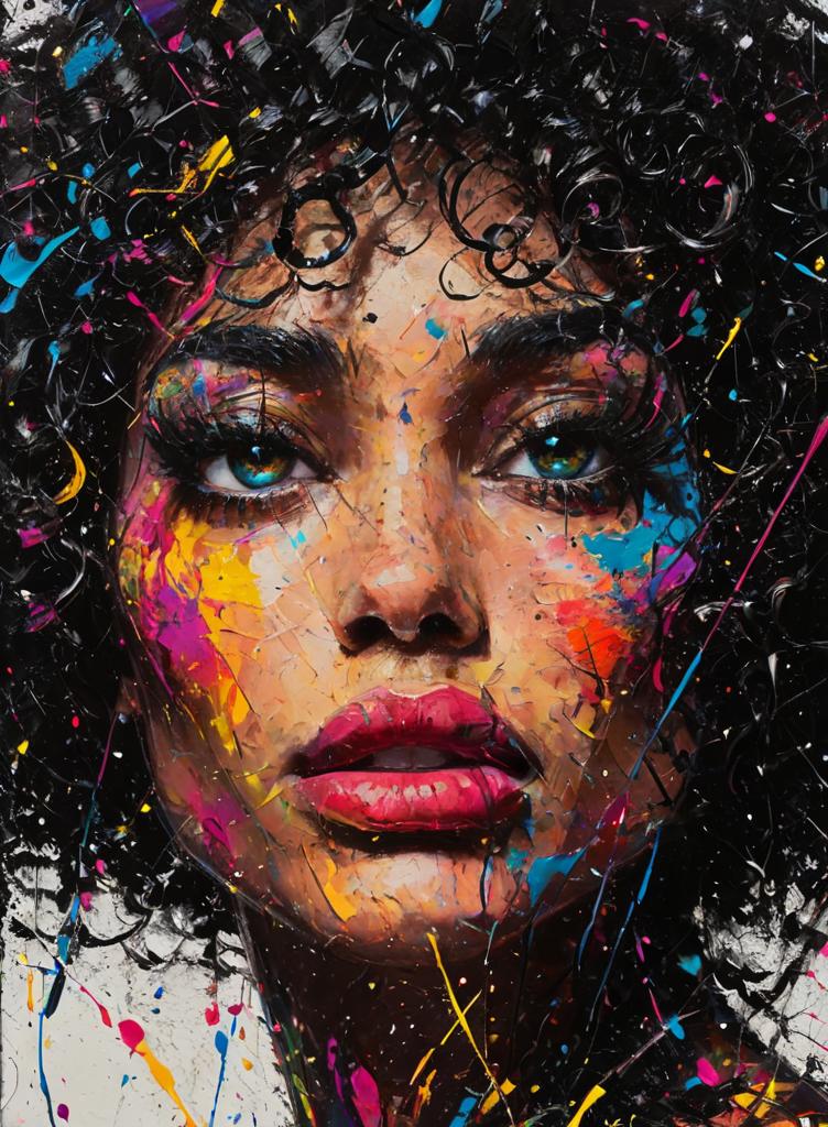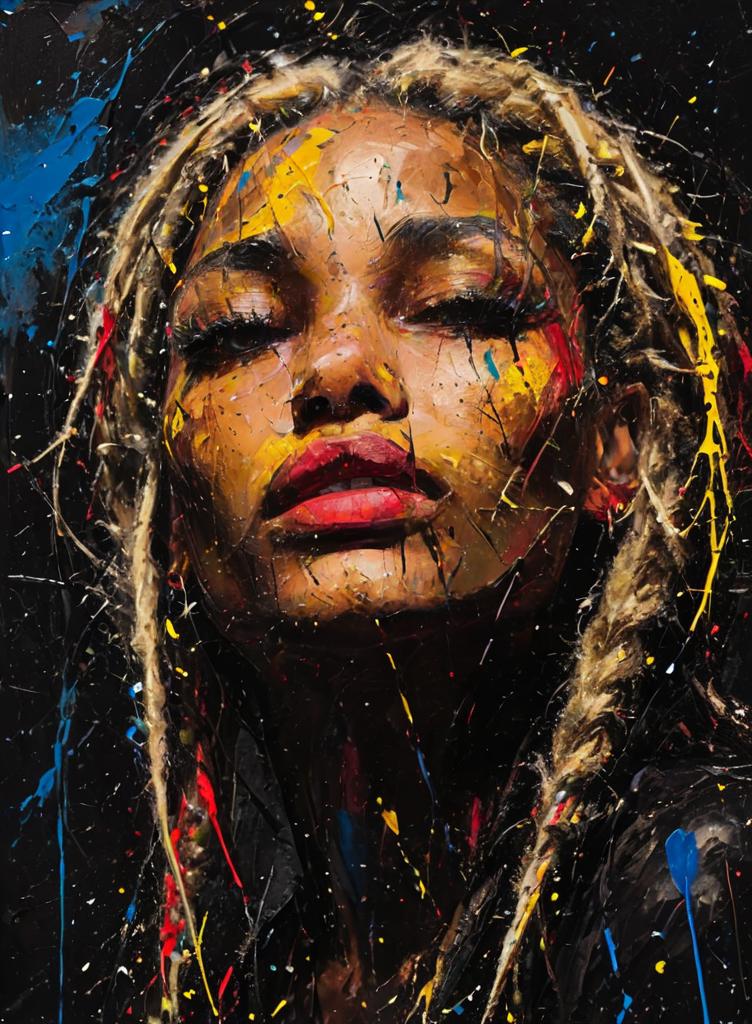 The stye is full l of energetic splatters, drips, and bold strokes of color, conveying a sense of chaos and emotion