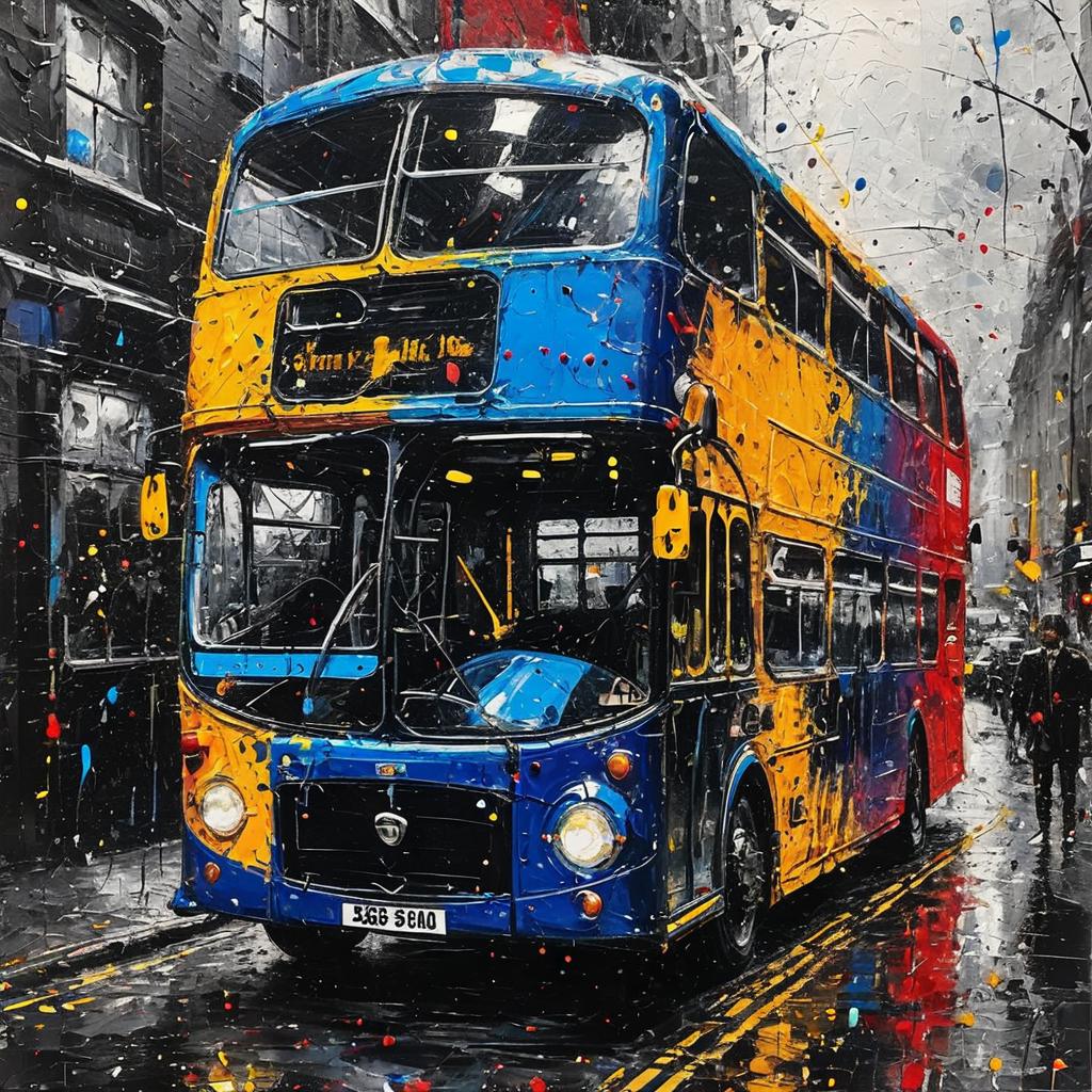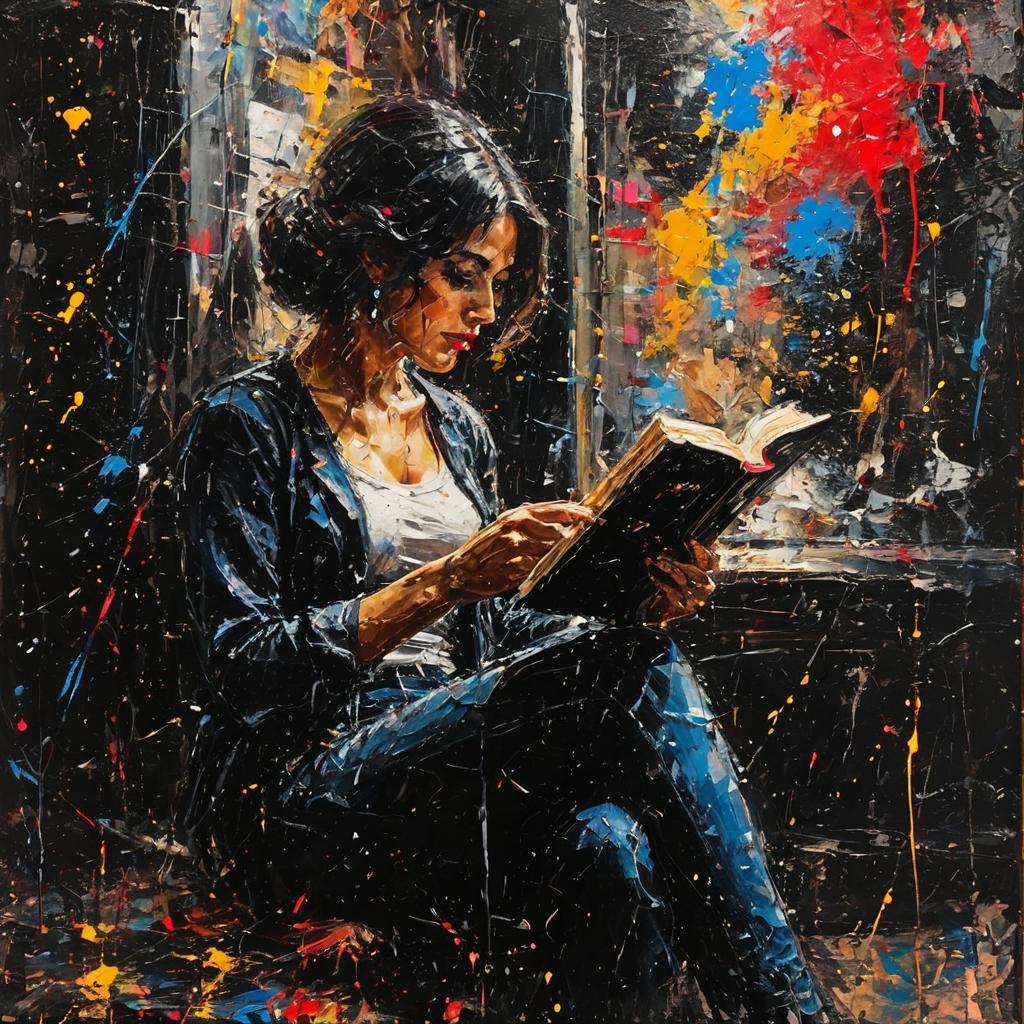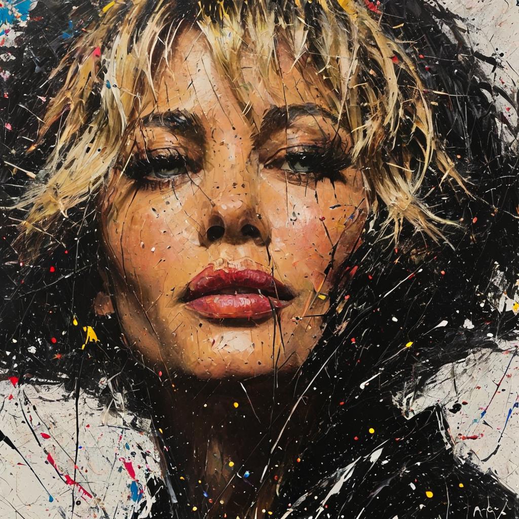 The stye is full l of energetic splatters, drips, and bold strokes of color, conveying a sense of chaos and emotion