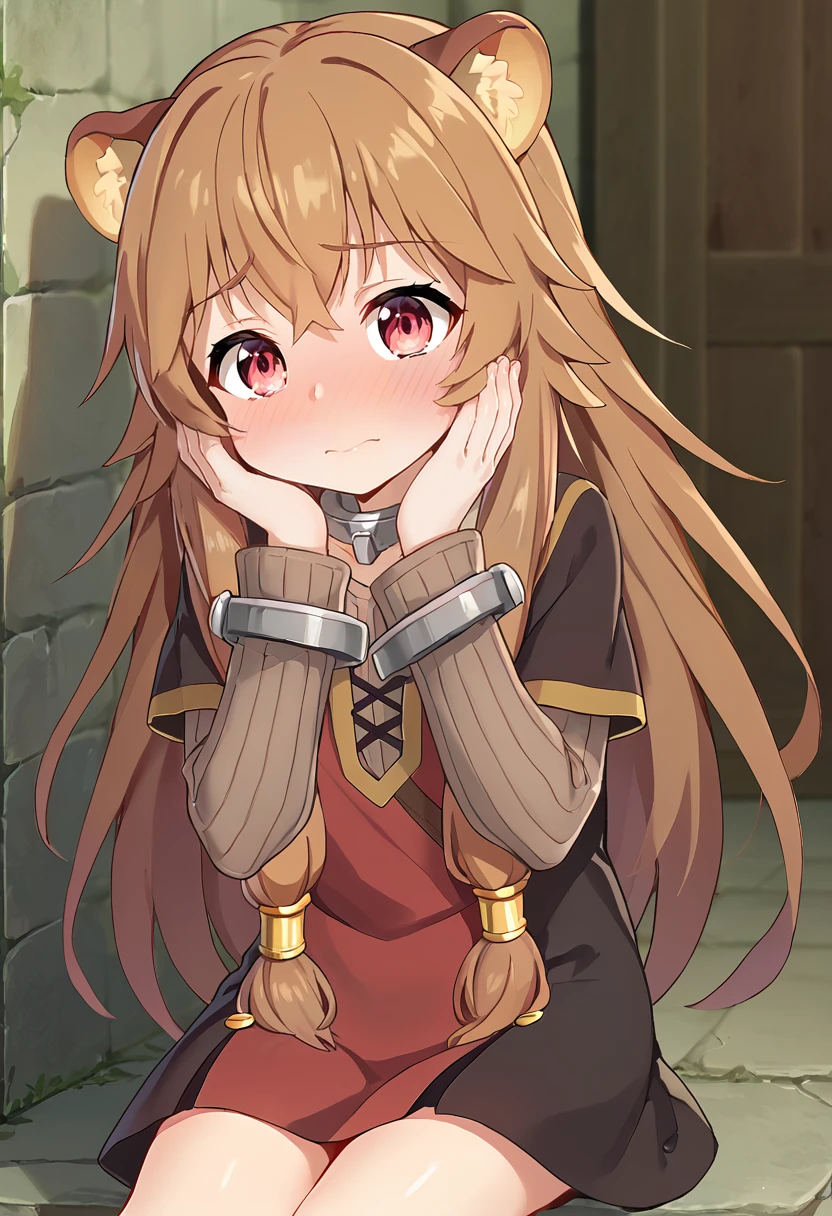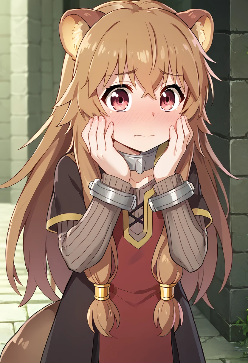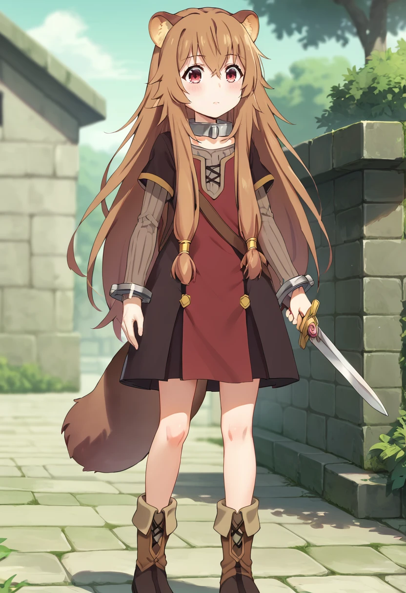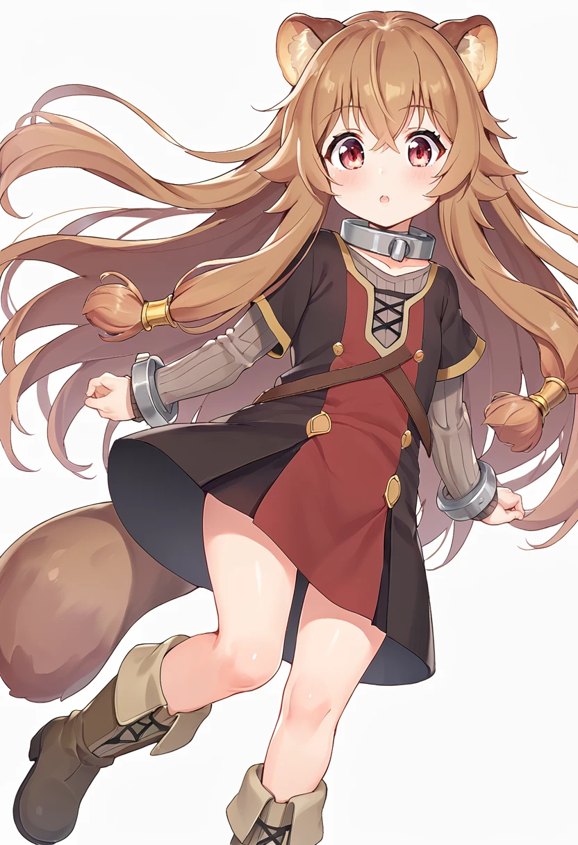 raphtalia,red eyes,raccoon girl,long hair,sidelocks,dress,long sleeves,boots