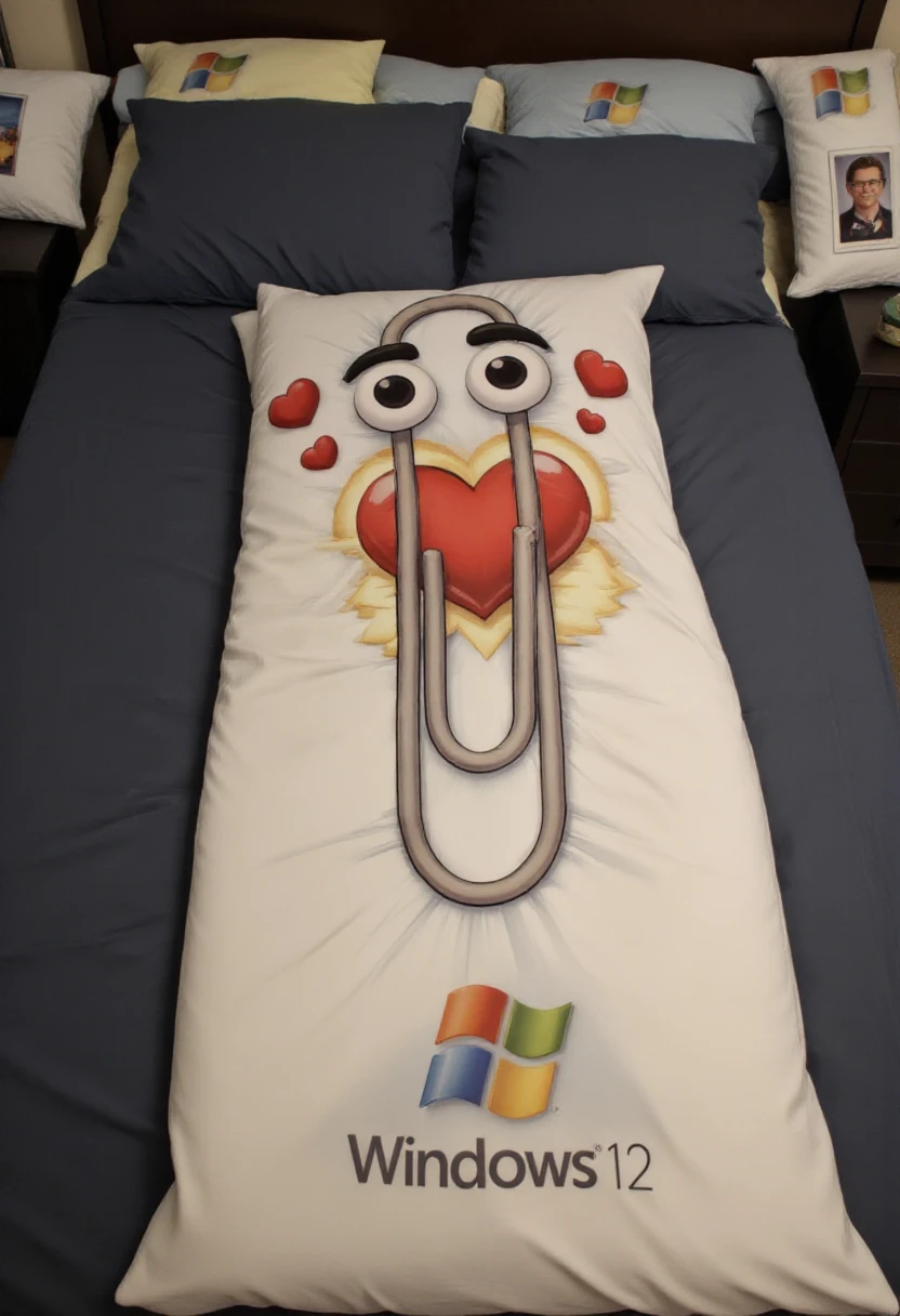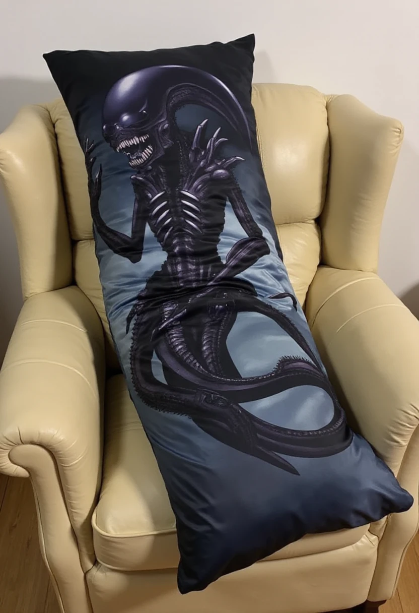 The image is a photograph featuring a (COLOUR) plush bodypillow in the shape of a (SUBJECT), displayed across a (COLOUR) leather armchair. The pillow is made of a soft fabric and has a stylized, cartoonish design.[on a bed]