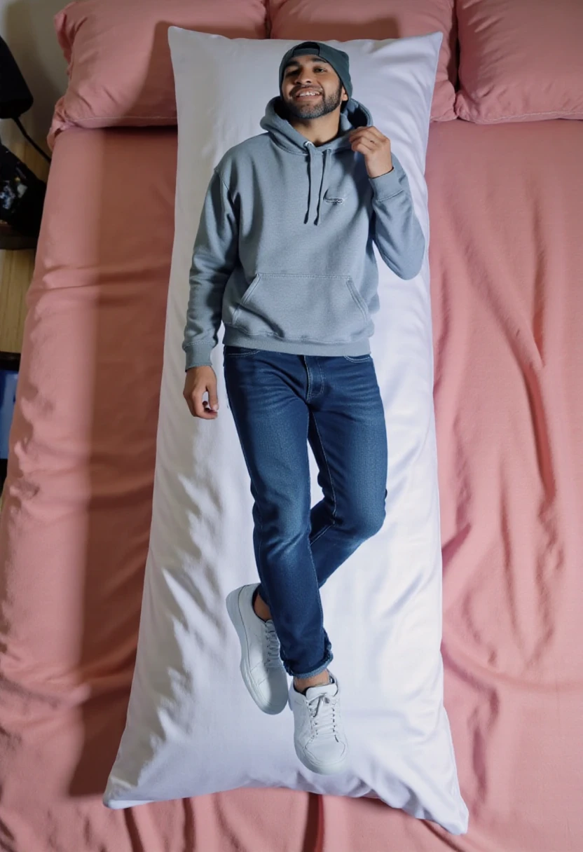 The image is a photograph of a plush dakimakura pillow featuring (SUBJECT) lying on a bed with a (COLOUR) comforter. The plush pillow is (COLOUR) with a high-quality, smooth texture, featuring a [colorful illustration / full body photo] of (SUBJECT).