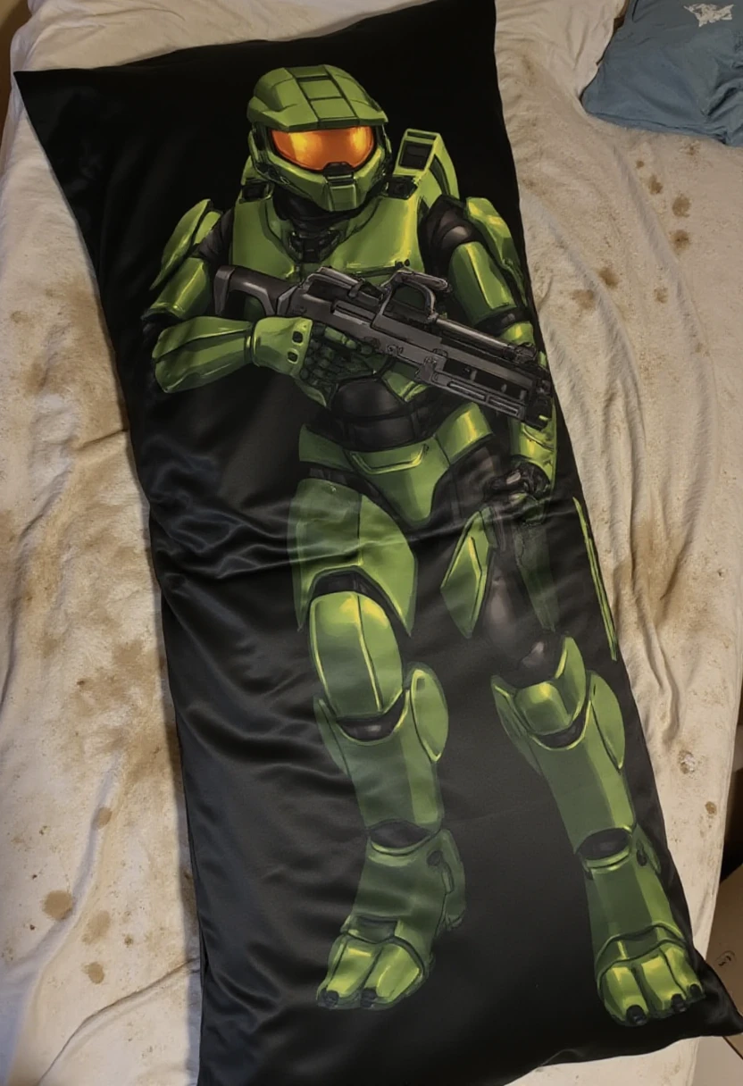 The image is a photograph of a (COLOUR) plush dakimakura pillow featuring (SUBJECT) lying on a bed with a worn, dirty looking comforter.