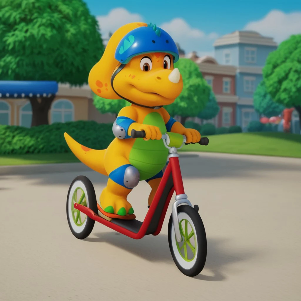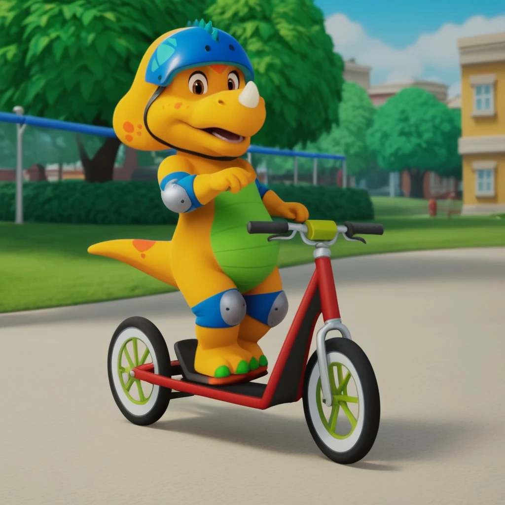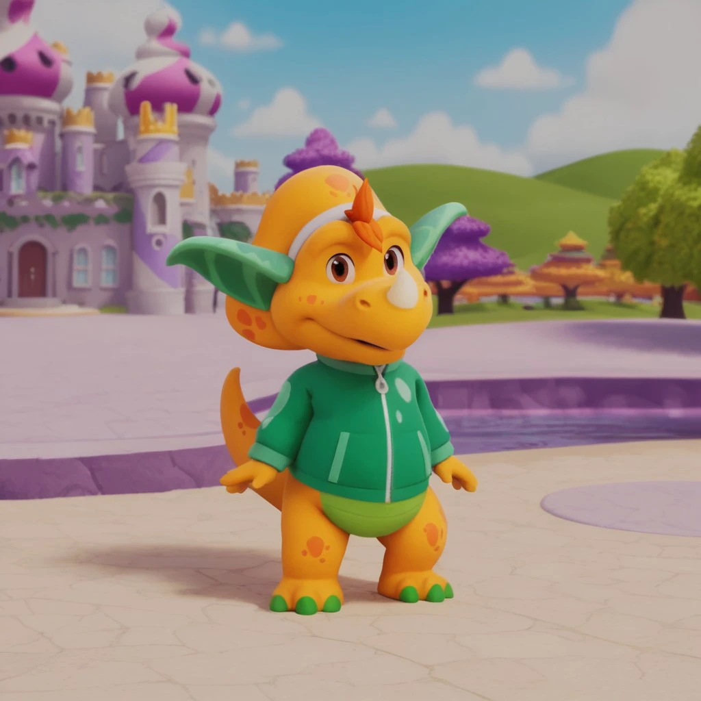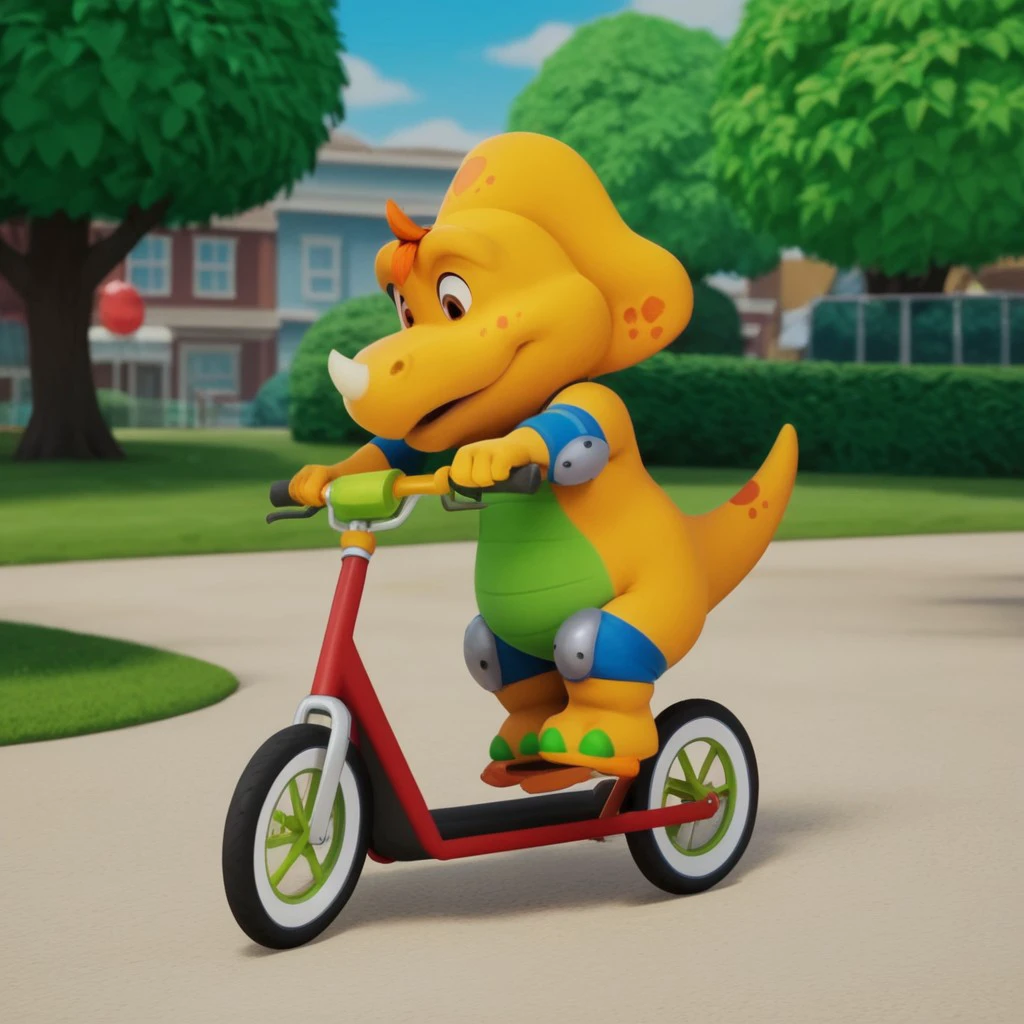 billybw, semi-anthro, male, dinosaur, yellow skin, orange hair tuft, brown eyes, nose horn