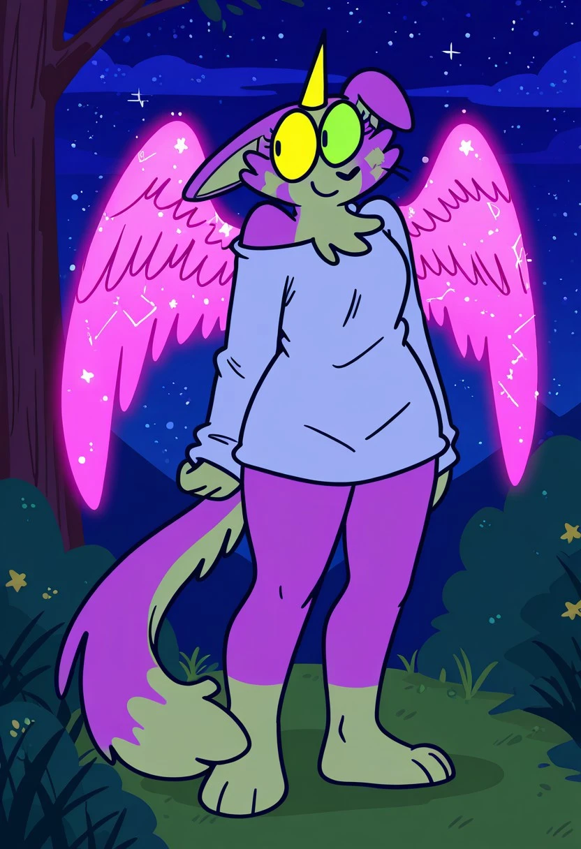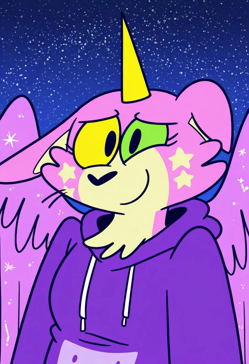 anthro, furry female, pink and yellow fur, stars on cheeks, animal ears, asymmetrical ears, single horn, yellow horn, animal nose, black eyes, yellow and green sclera, colored sclera, heterochromia, feathered wings, tail