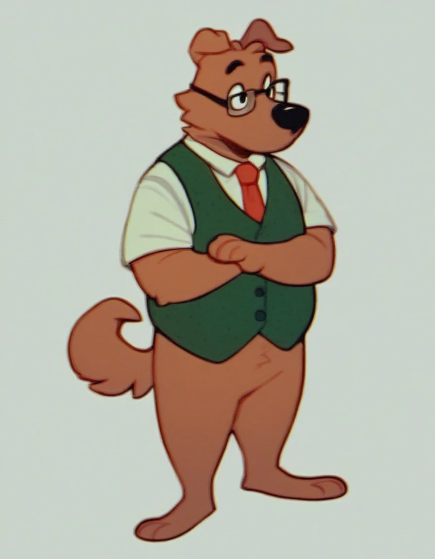 Kolin_Kelly, 1boy, necktie, vest, no humans, red necktie, furry, green vest, furry male, white shirt, black eyes, glasses, dog, brown fur