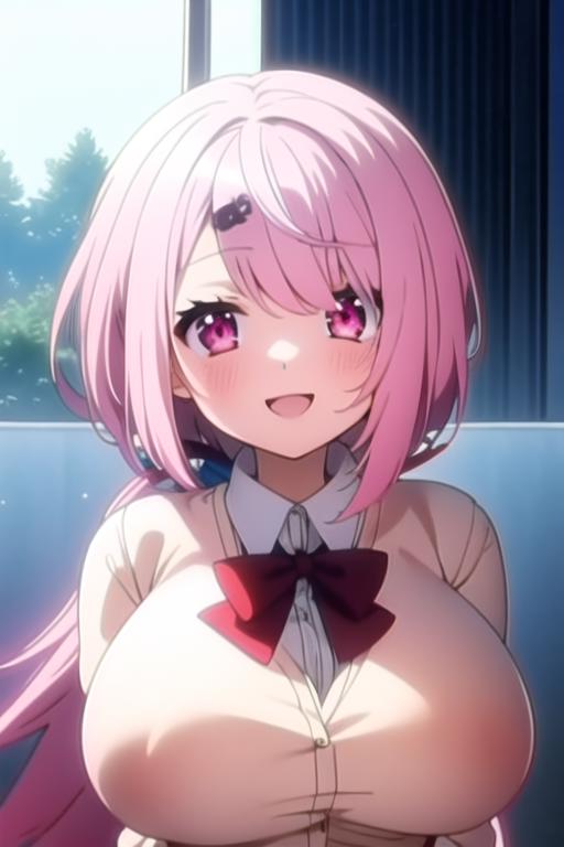 sample prompt: <lora:shiinayuika:0.9>, shiina yuika, long hair, low ponytail, pink and white hair, multicolored hair, red eyes, hair clip, huge breasts, tareme,