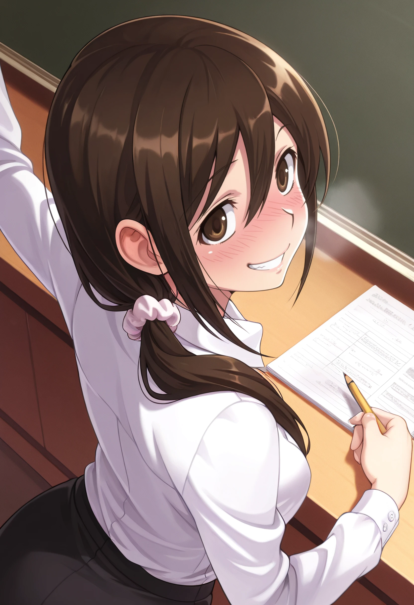 JunSchool, shirt, dress shirt, white shirt, long sleeves, collared shirt, scrunchie, teacher, skirt, pencil skirt, hair ornament, black skirt, , hair scrunchie,