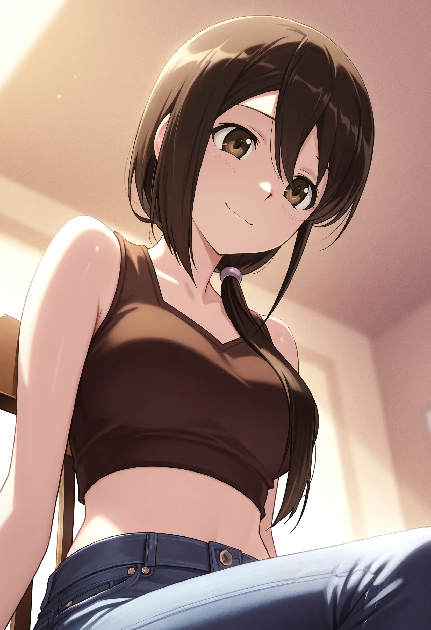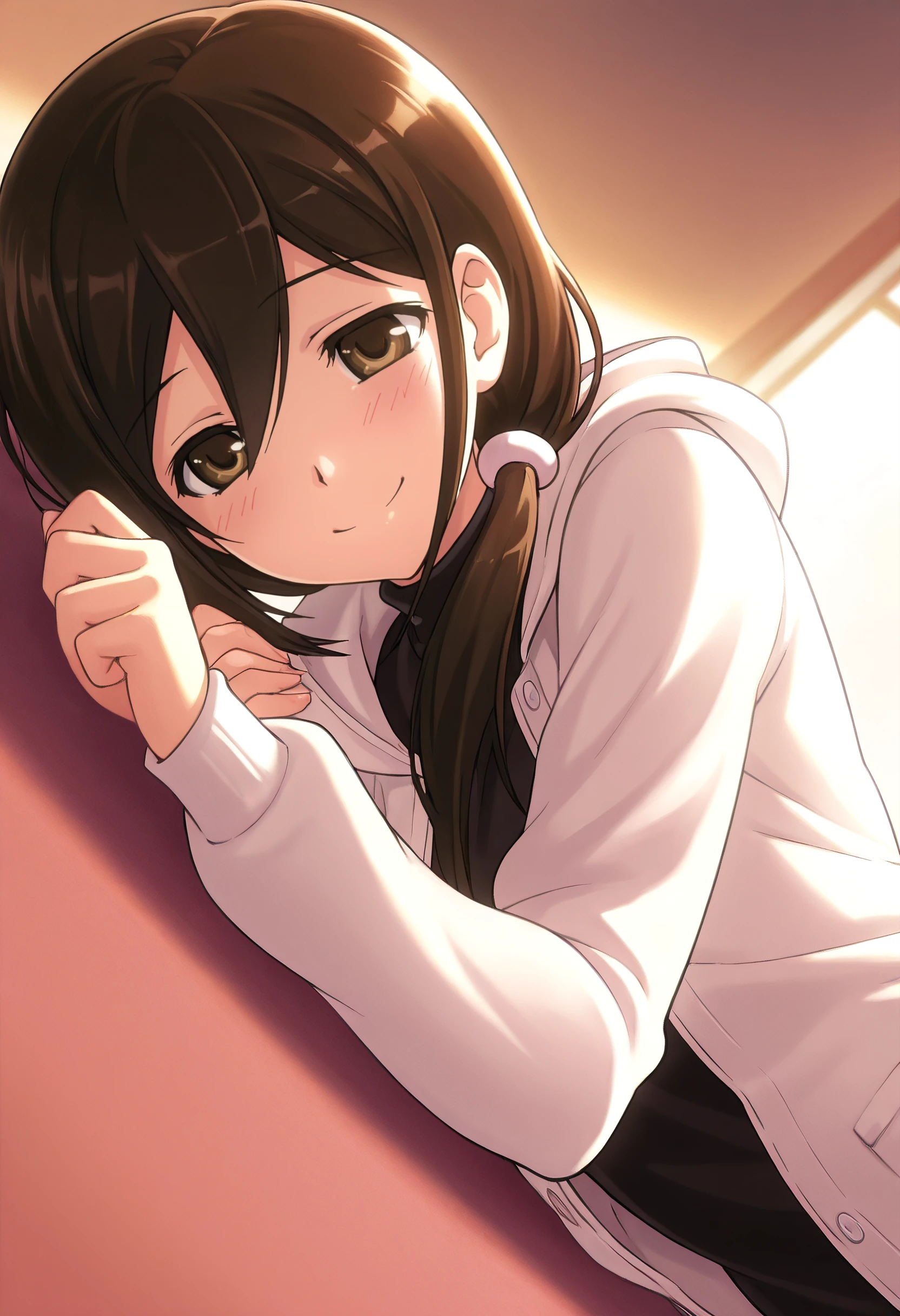 KNZJun, brown hair, brown eyes, long hair, hair over shoulder, ponytail, low ponytail, side ponytail, hair between eyes,
